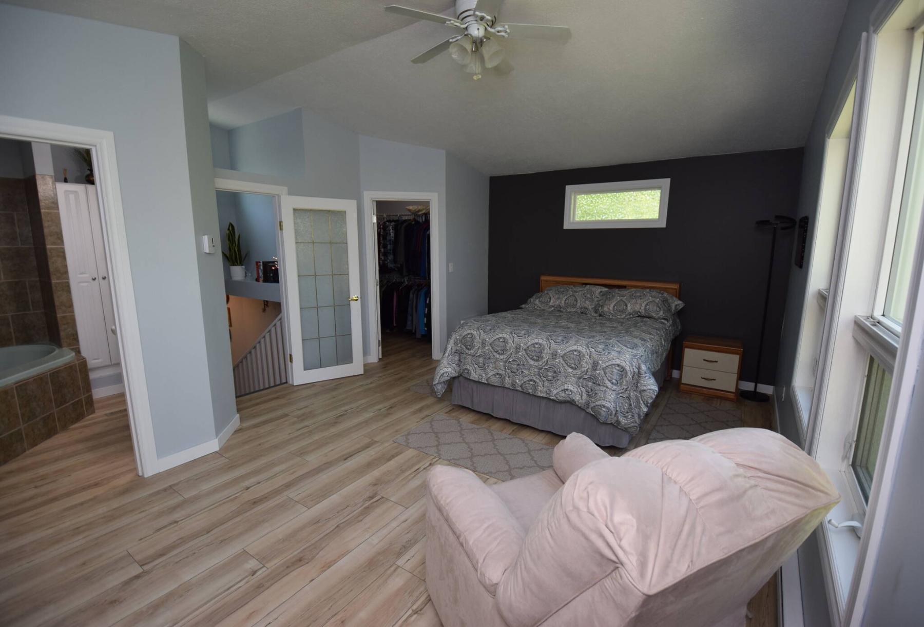 “It has two huge windows on the rear wall that look onto the amazing backyard and a vaulted ceiling that gives it a nice airy feel. It also has a cozy, private ensuite with jetted jacuzzi tub.”