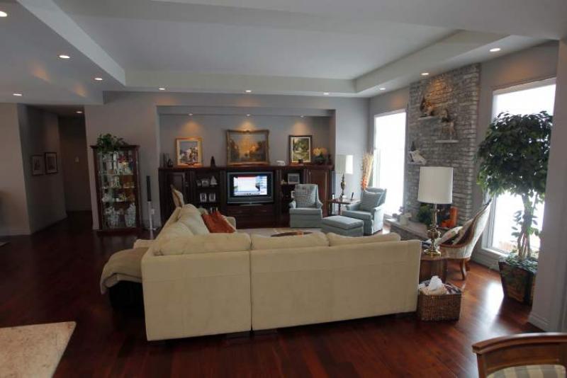 Rustic relaxation is the theme in the great room, which features a family room with a gas fireplace set in grey Tyndall stone beneath a tray ceiling surrounded by pot lights and a built-in maple entertainment unit. An island kitchen with wide aisles, granite countertops, a host of cinnamon-tinted maple cabinetry and a huge dinette area (both on dark, rich maple hardwoods) round out a space that's ideal for entertaining.