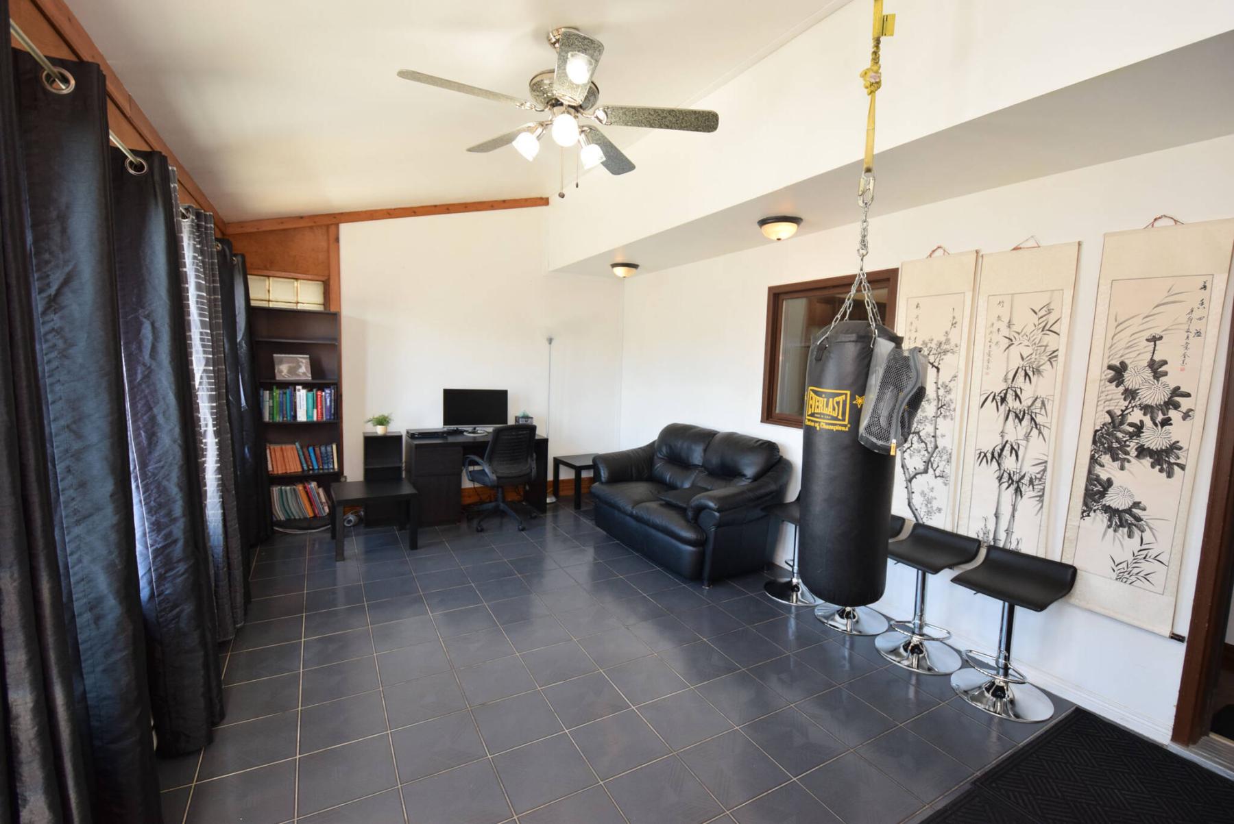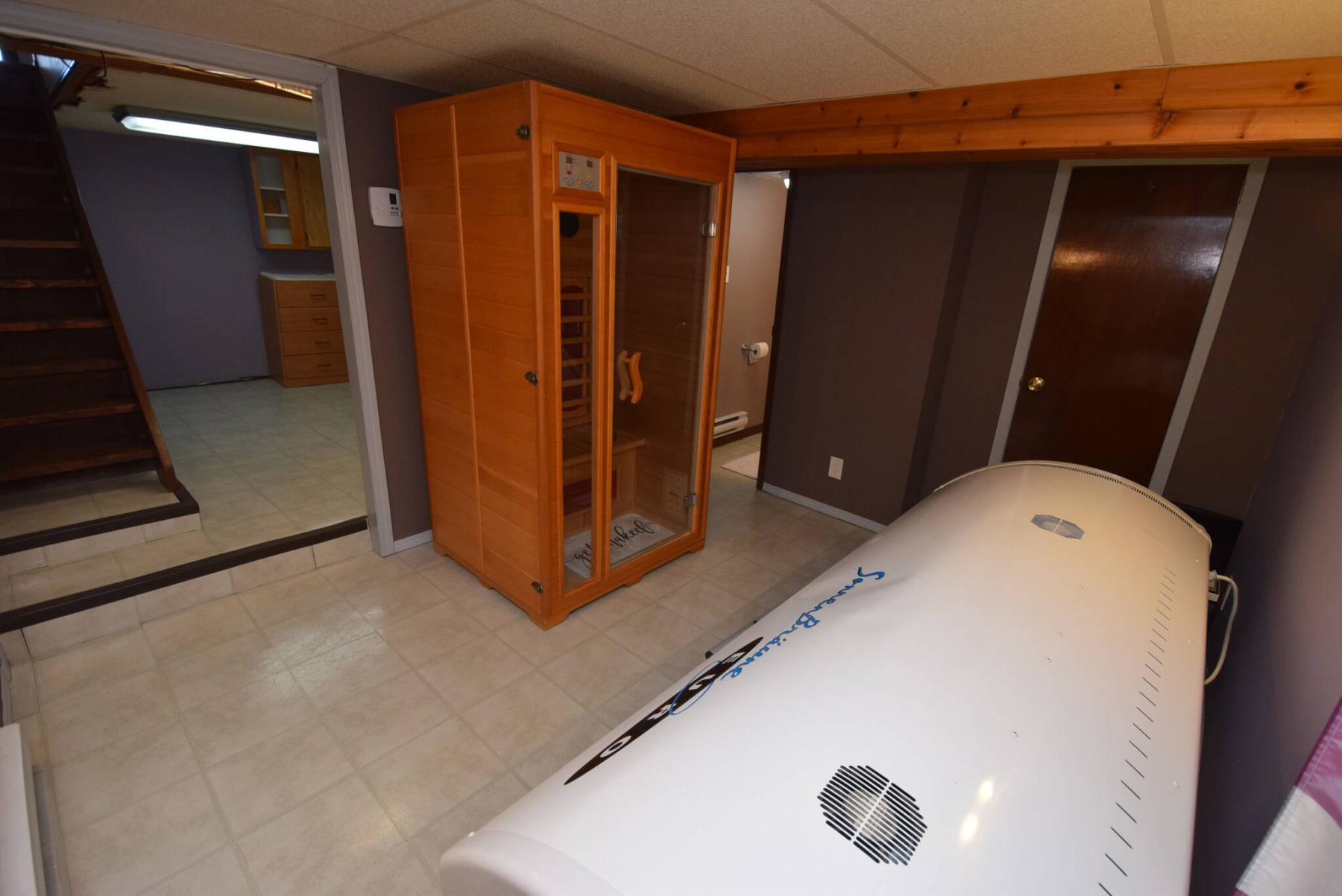The home’s lower level features a flex space with portable sauna and tanning bed, as well as a bedroom, bathroom and laundry room.