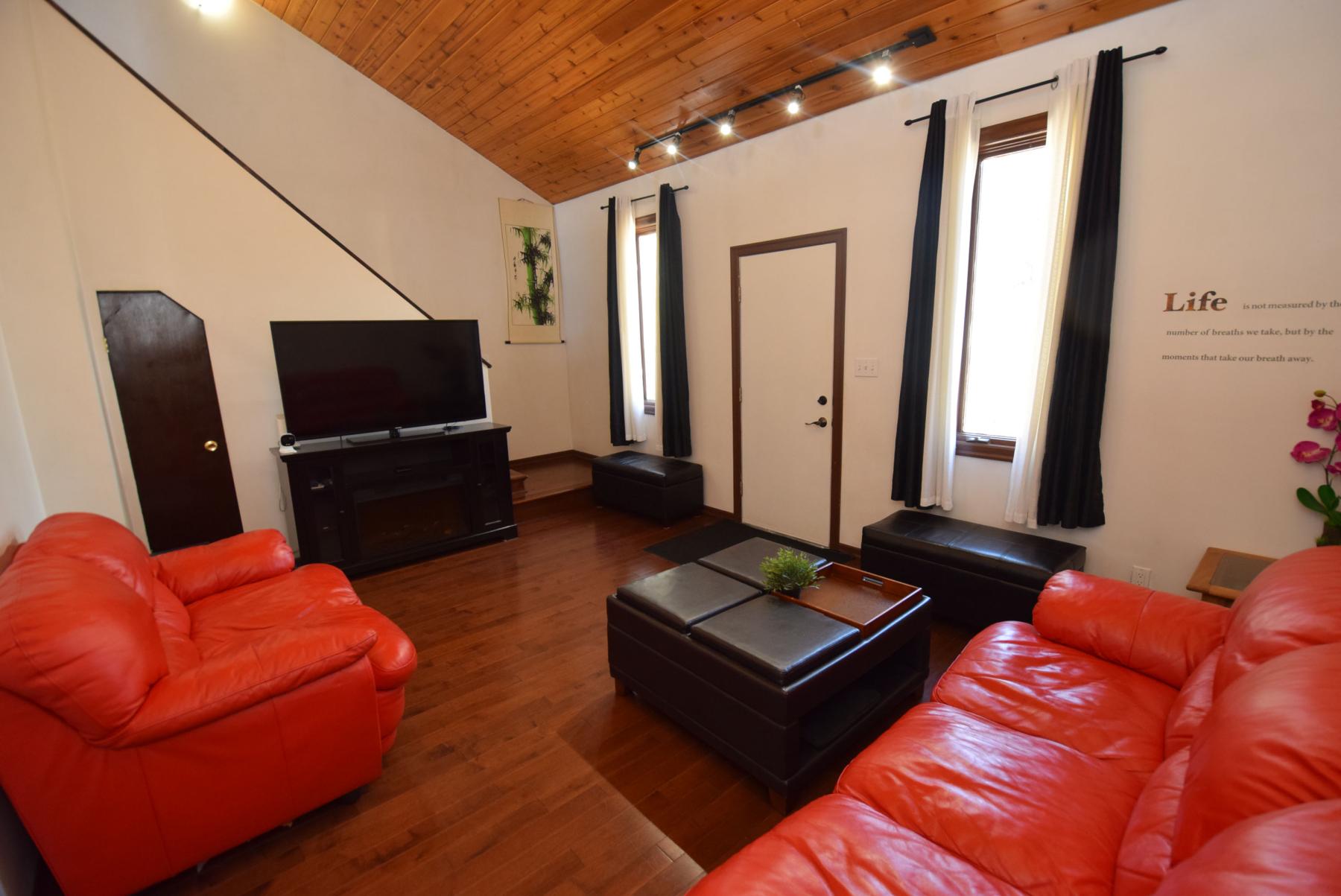“When you step inside, you’re greeted by a huge family room with a soaring and amazing pine-lined vaulted ceiling,” Benger says. “Large windows on either side of the front door flood it with natural light, while gorgeous cappuccino-maple hardwoods add warmth.”