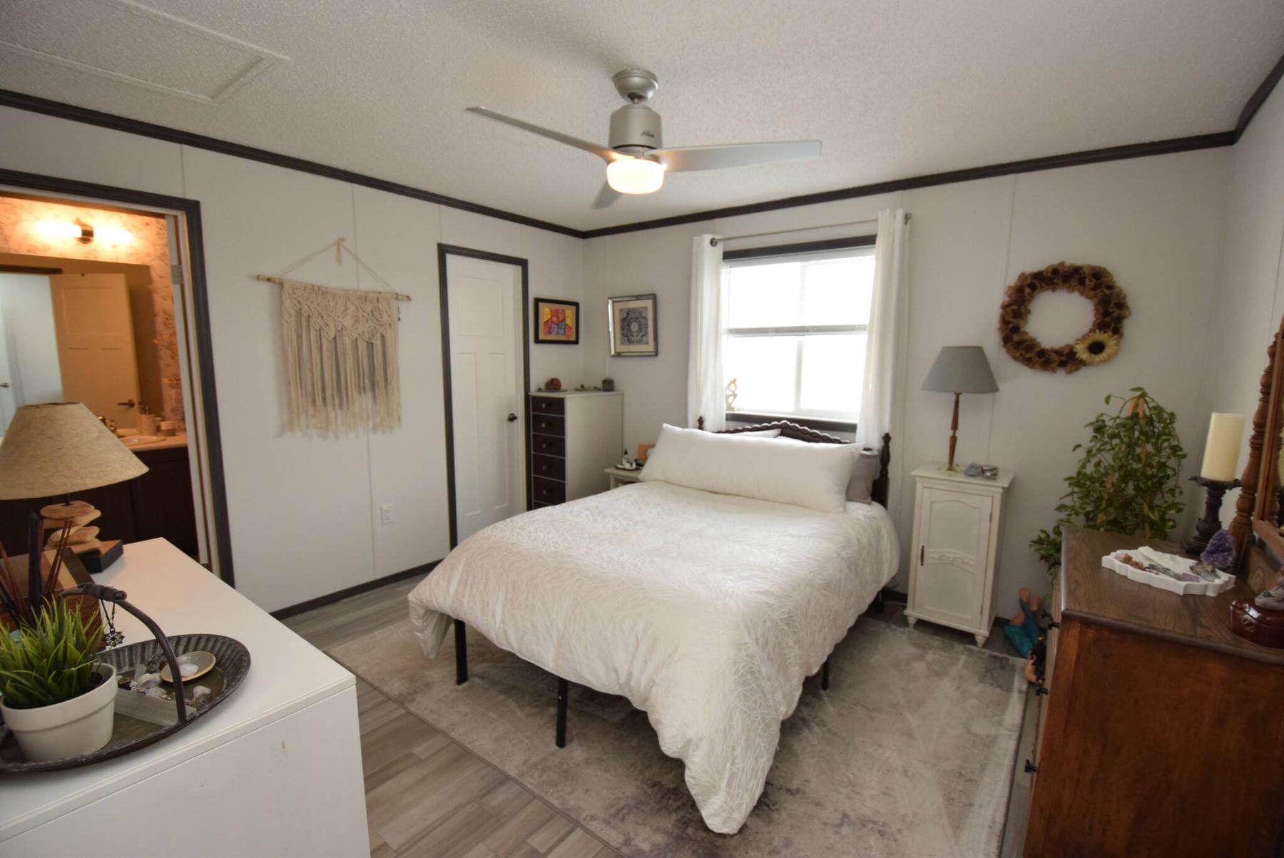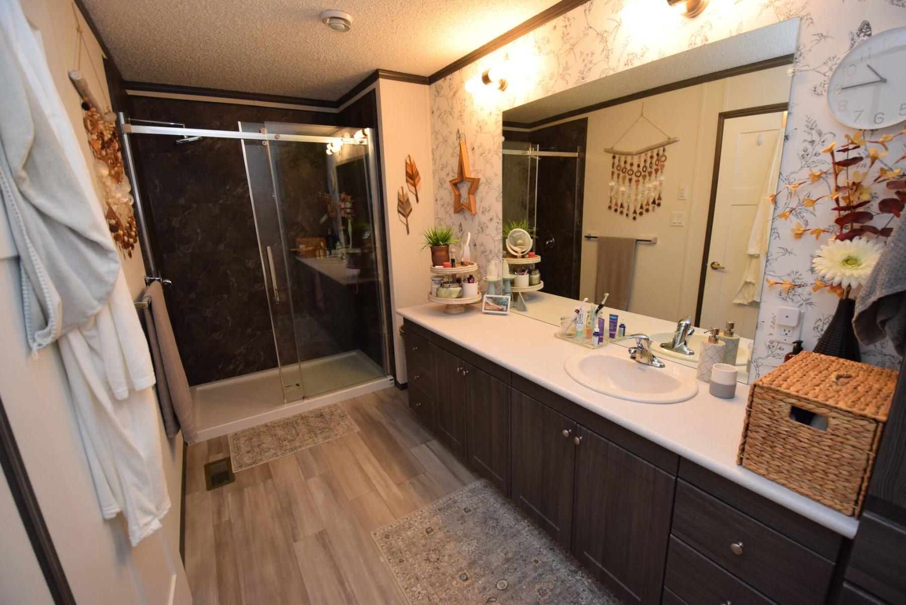 “Not only is the ensuite pleasingly spacious, but it’s also very well-appointed,” says Sonnichsen. “It comes with a five-foot walk-in shower with tile, that not only has a tempered glass door, but also a beautiful tile surround and rain shower head. The brown thermofoil vanity also offers tons of storage. There’s also a large walk-in closet for good measure.”
