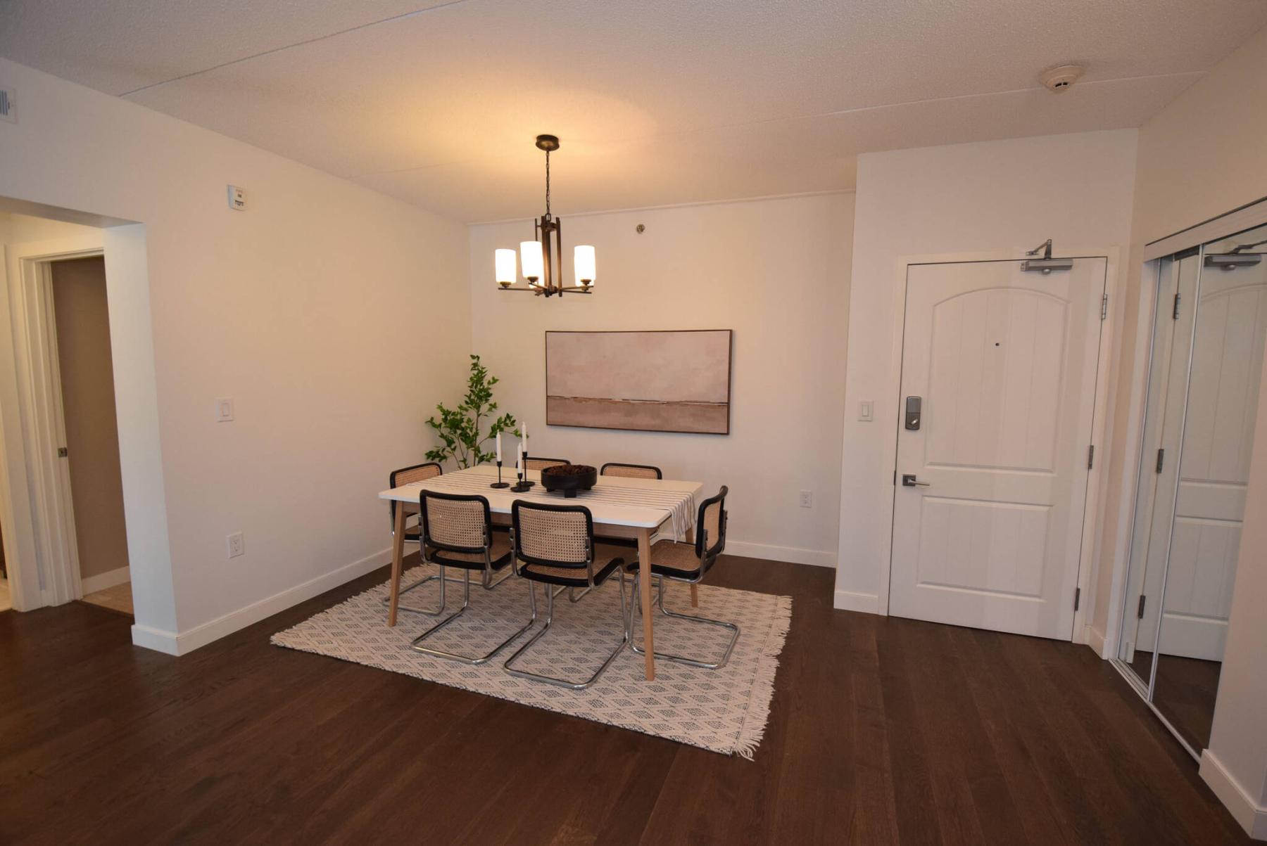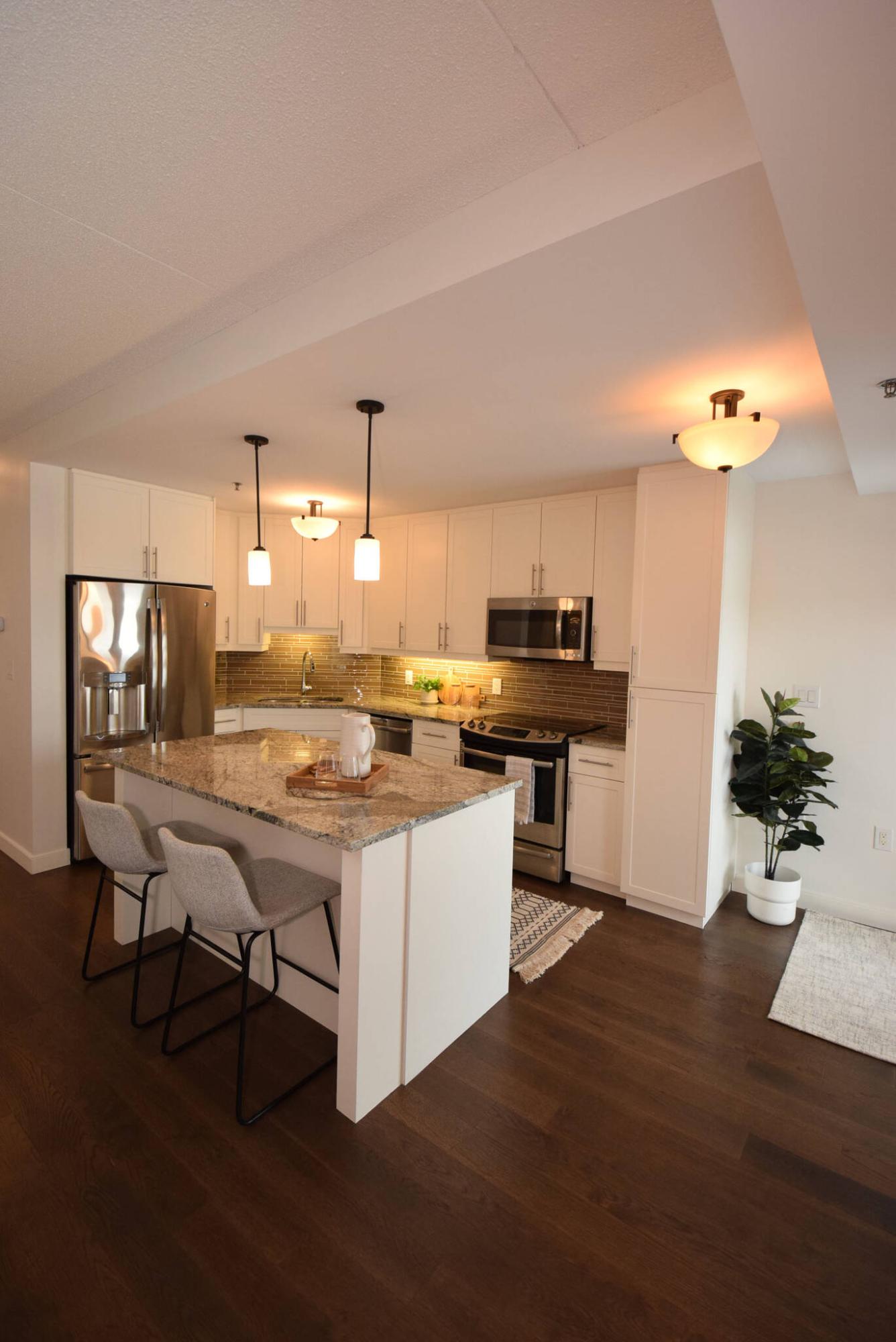 “It gives you the same feel you would have had at home. The island offers plenty of prep space and an eating nook for two, and the finishes — white cabinets, a toffee-toned tile backsplash, granite counters and stainless-steel appliances — are gorgeous. A patio door on the kitchen’s rear wall also leads out to a large, covered balcony that offers downtown and river views.”