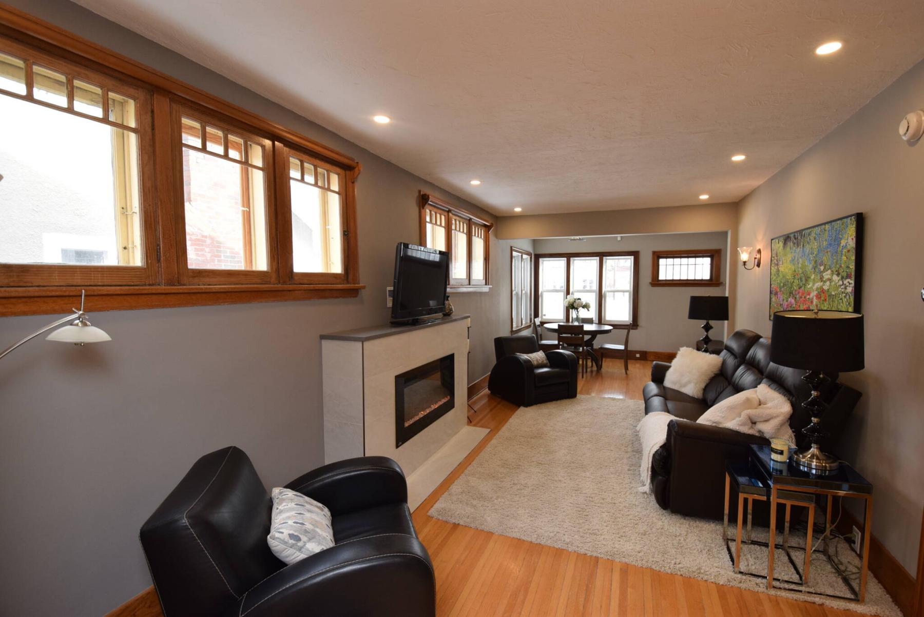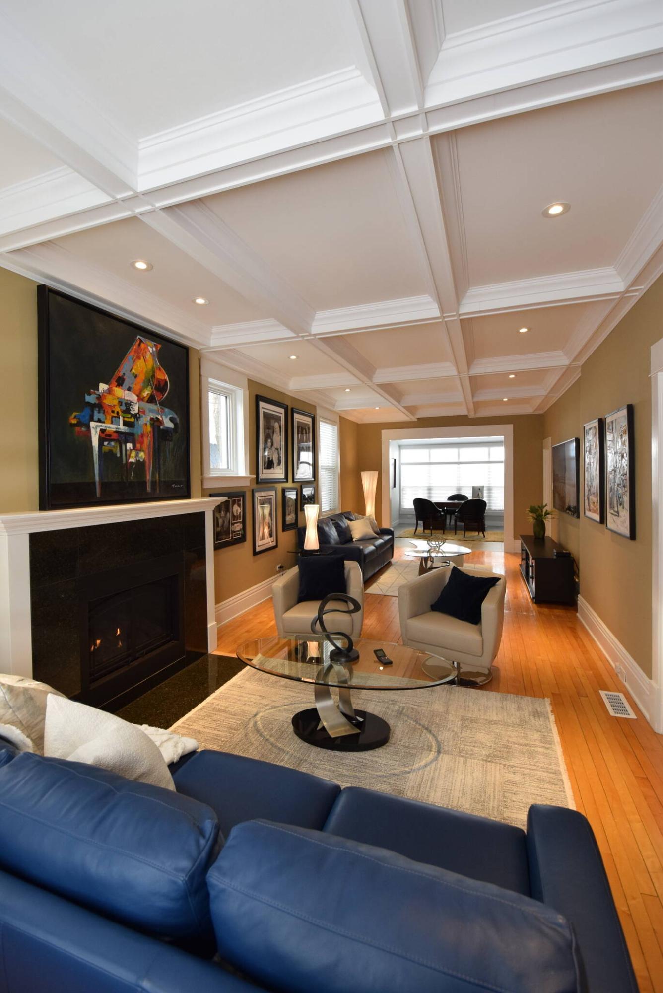 A gorgeous tray ceiling with LED pot lights runs the entire length of the living room at 115 Campbell, which also comes with a beautiful gas fireplace.
