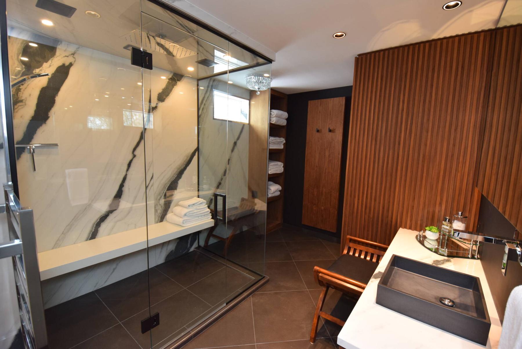 Spa-like in its design, the main bath in 115 Campbell comes with a steam shower with gorgeous quartz tile surround, heated tile floor, heated towel rack and walnut vanity with a mod black raised sink.