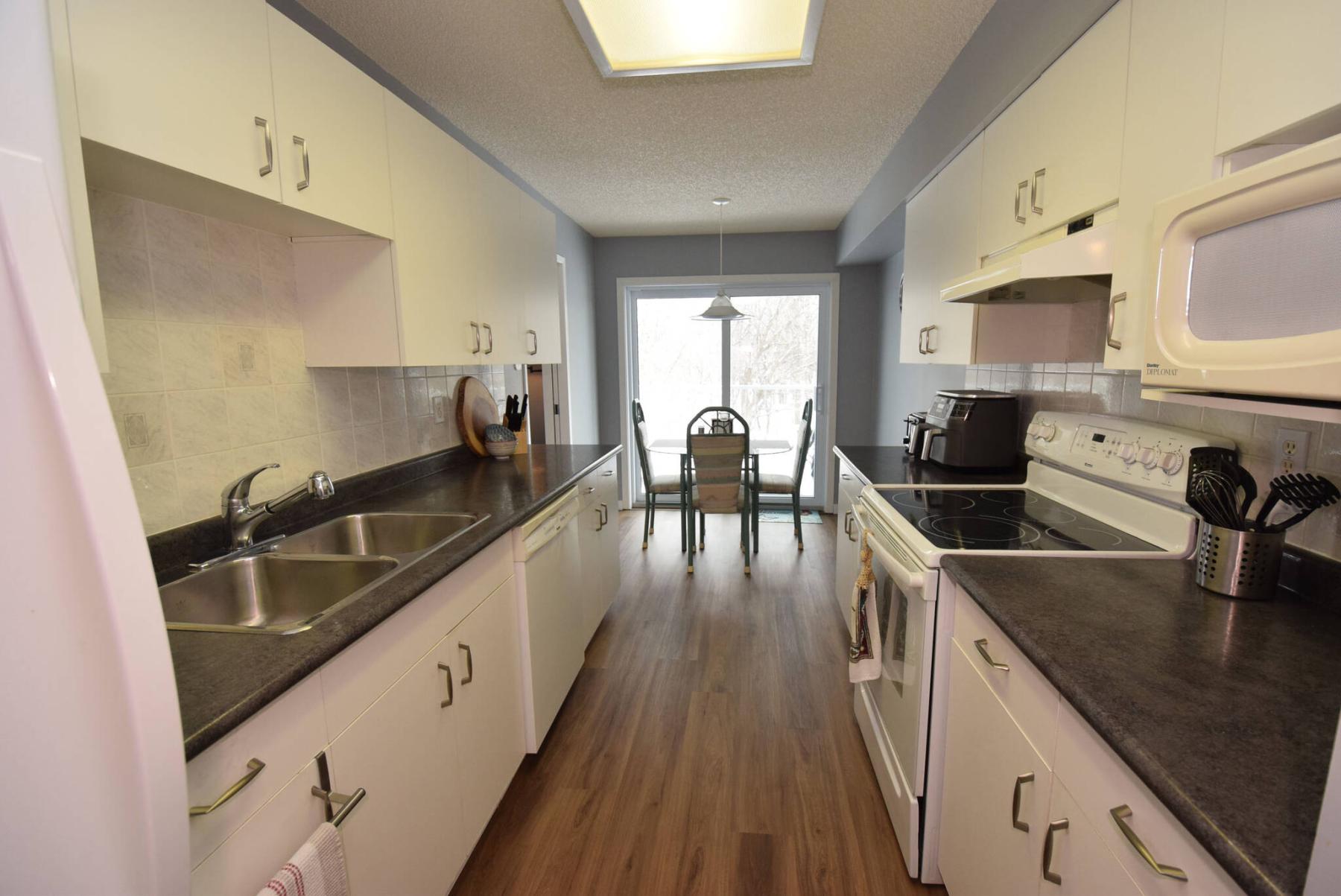 A sliding patio door on the kitchen’s rear wall frames the kitchen’s eating area, providing gorgeous forest views and access to a spacious covered balcony.
