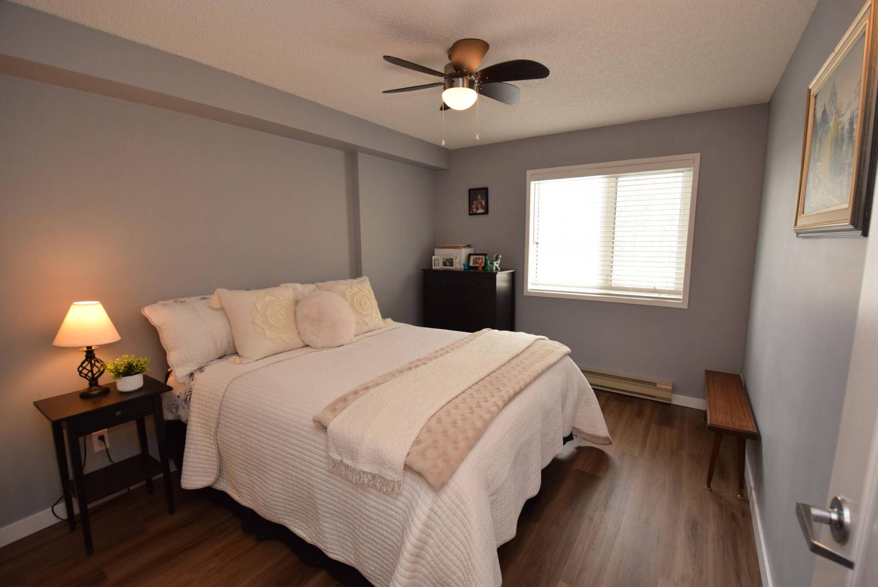 Set next to a full bath, the roomy second bedroom could serve as a guest suite or office.