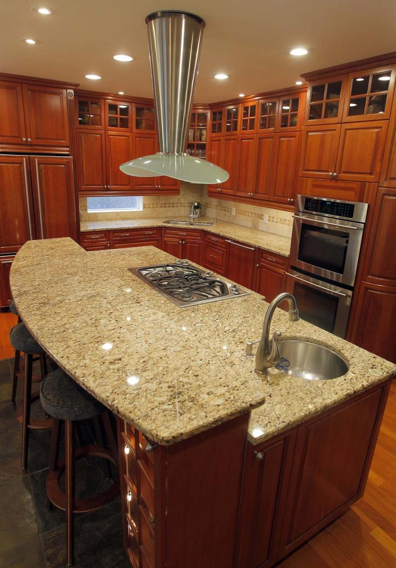 Maple cabinetry defines the kitchen, which also includes granite counters, a double wall oven and an oversized prep island with eating nook.
