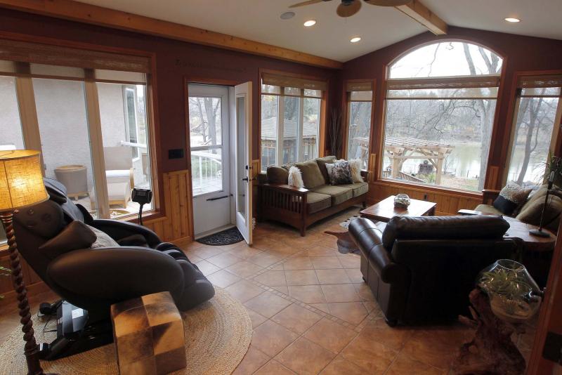 The house’s sunroom, which leads out to an upper-level deck, can be enjoyed through all four seasons and provides views of the river though its many, huge windows.