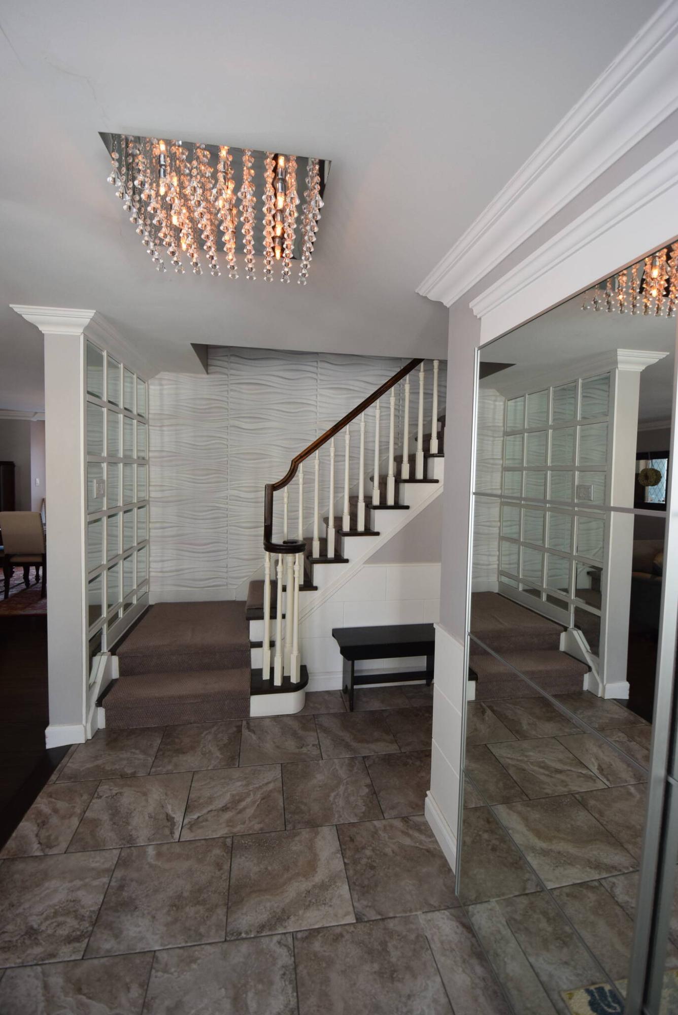 A wide richly tiled foyer with mod light fixture above and striking, semi-enclosed upper-level staircase with textured white wall cladding starts the home off in modern/traditional style.