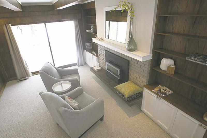 "It's a wonderful, big space (12.2 feet by 18 feet) that features a fireplace set in grey brick, walnut veneer bookcases on either side of the fireplace, walnut veneer beams above and the same panelling on the walls," said Peitsch. "It also has new light taupe berber carpet and a large window. It's a functional, cosy space."