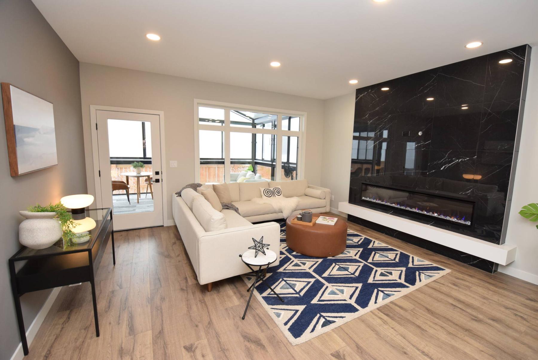 “Its focal point is a black, marble-style feature tile wall with an inset linear electric fireplace that’s set off perfectly by a white mantel just below it. A huge window on the right side of the rear wall lets in tons of natural light, while a patio door on its left side provides access to a wonderful three-season sunroom.”