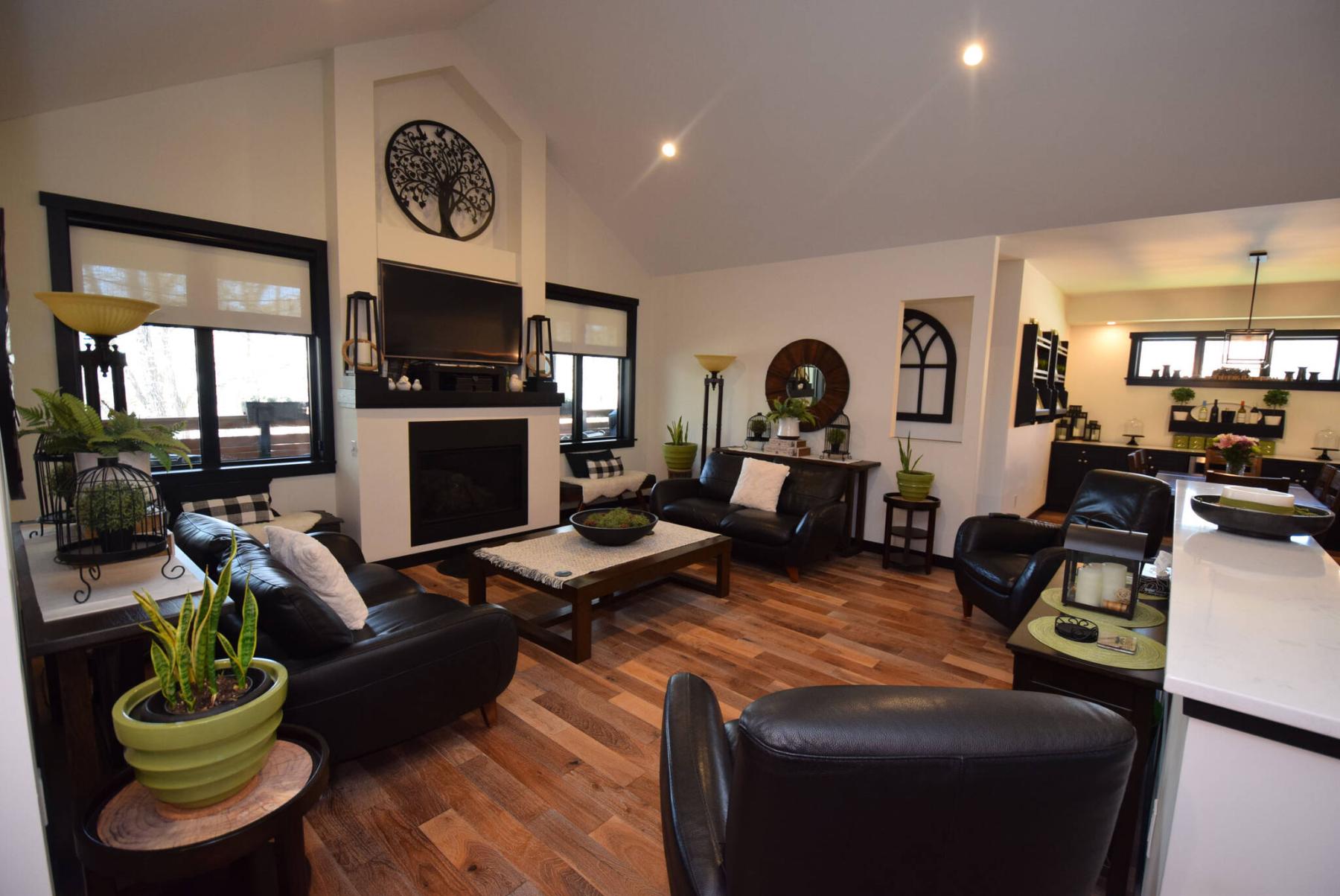 A dramatic vaulted ceiling lined with pot lights adds a sense of space and style, while espresso-stained oak cabinets and off-white quartz countertops in the kitchen add texture and contrast.