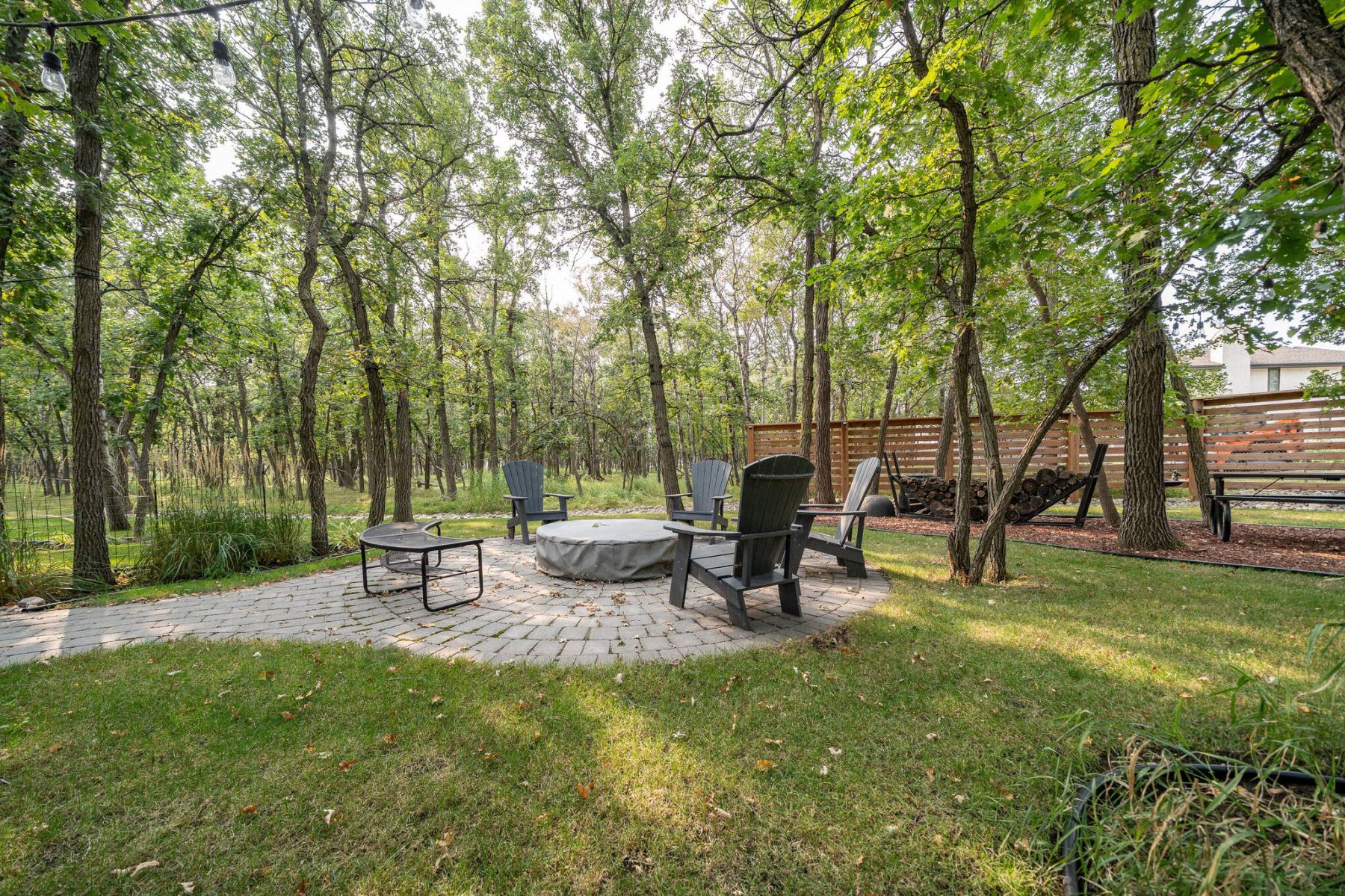 A lock-stone pathway leads to a firepit area in the home’s private, treed backyard.