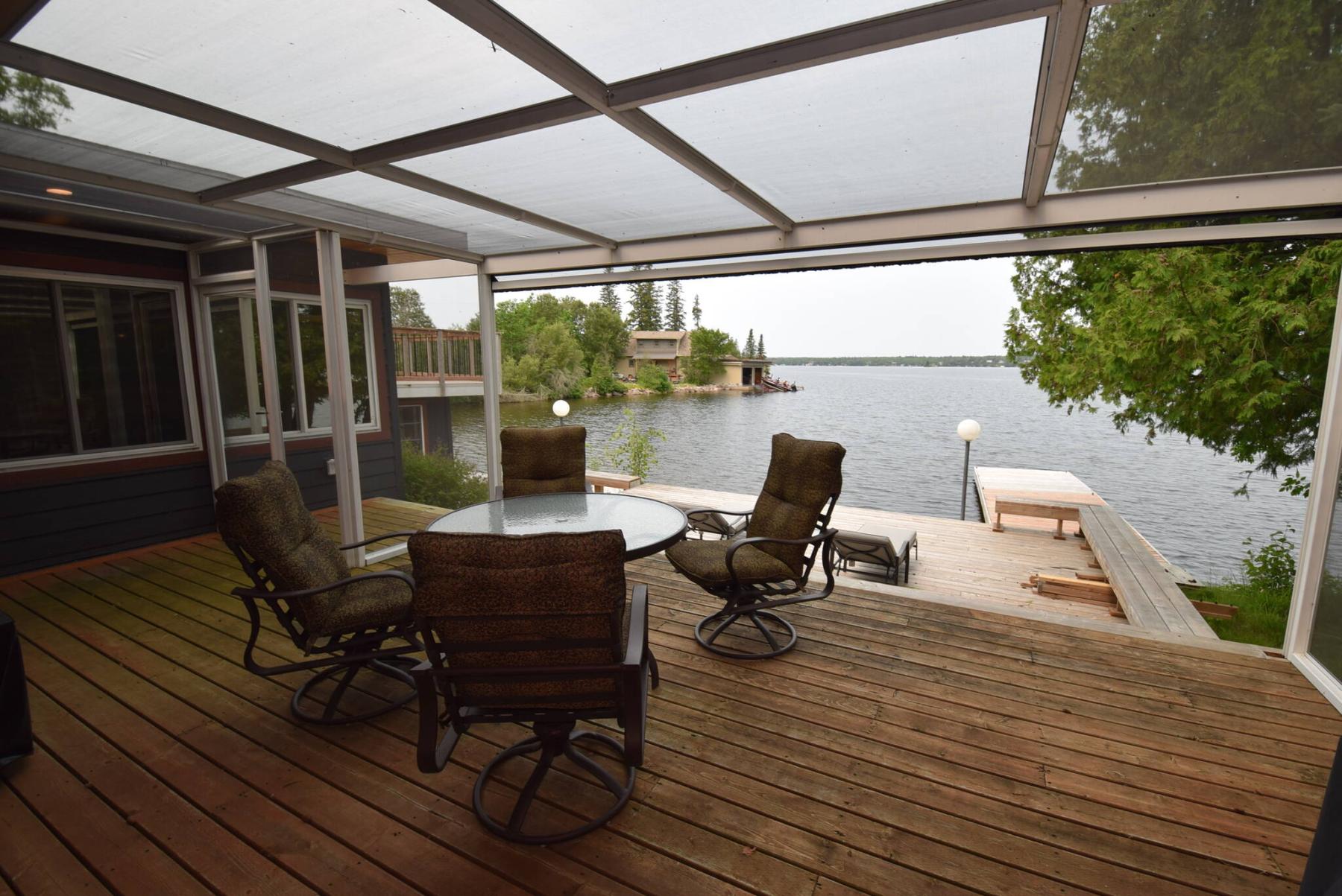 Add in a storage building with suite with balcony up top, a private beach next to the property and a private area with six-person hot tub, and you have a fully winterized lake home that has it all.