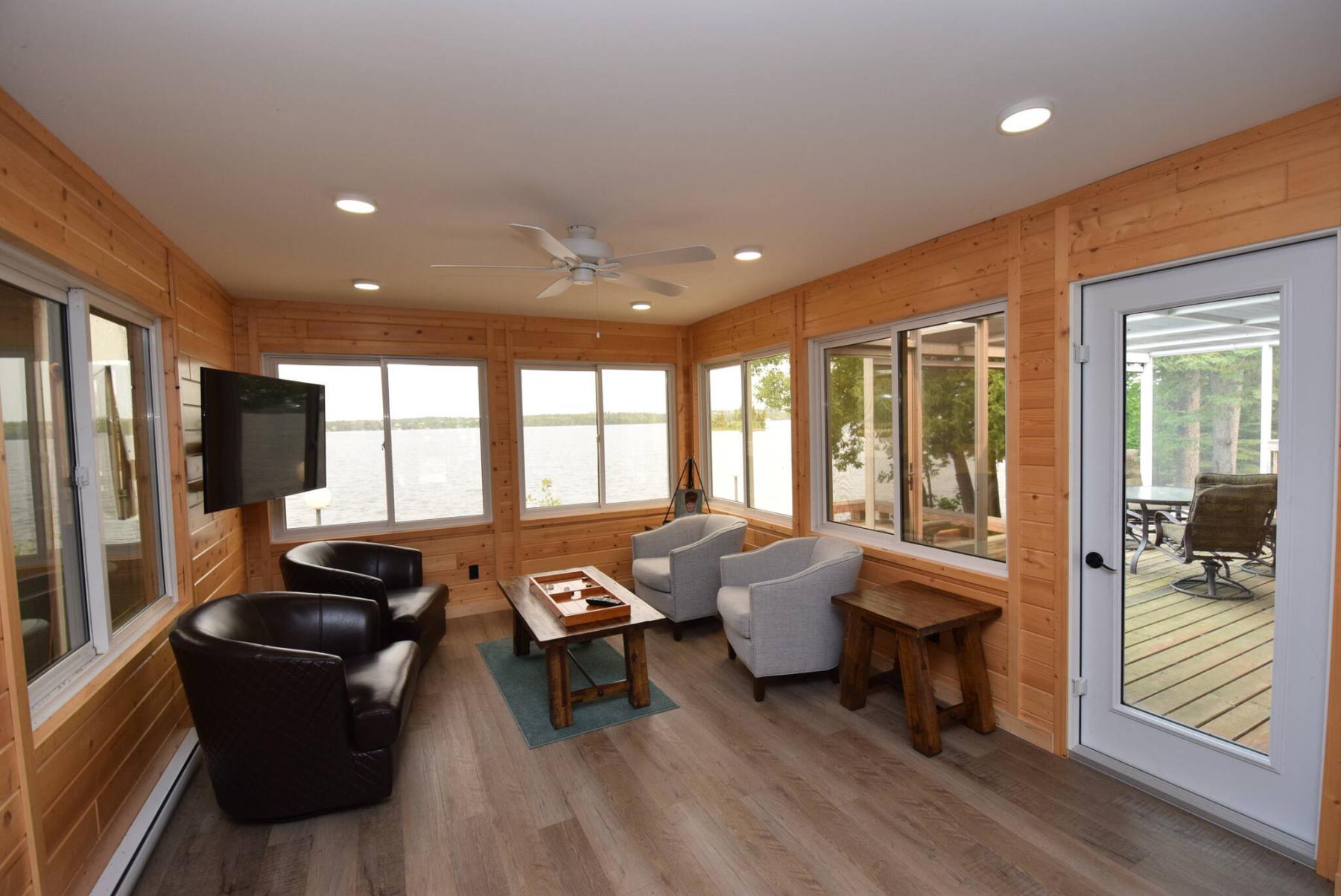 “Just like everything in the home was redone, the windows were also updated in 2021. “And they’re huge, starting with the sitting area, which not only has the lake view, but a patio door that leads out to a big deck.”