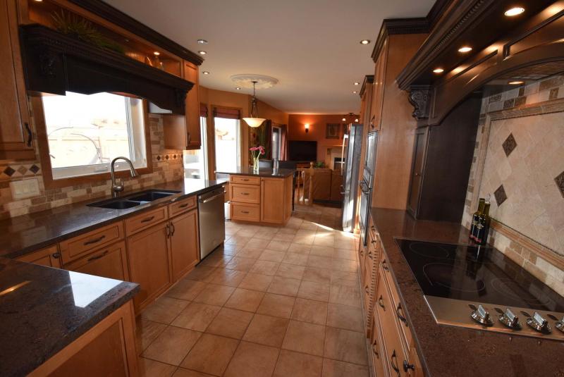 "It’s magnificent," Olyniuk said. "With its quartz countertops, work-of-art travertine tile backsplash, dovetailed, two-tone maple cabinetry, tile floor and Frigidaire Professional Series (stainless) appliances, it’s an absolute dream kitchen. There’s also an island with storage and seating for two next to a big bay window, and a double under-mounted sink beneath a window that gives you a great view of the incredible backyard."
