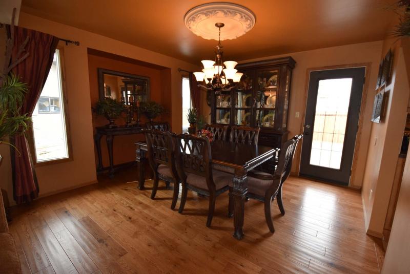 Meander back the other way through the richly finished (and spacious) kitchen, and you arrive at another doorway that leads to the living room/dining room. The dining room — which can seat six to 12 — is elegantly defined by a chandelier with decorative white medallion on the ceiling, and features a patio door that provides seamless access to the pool.