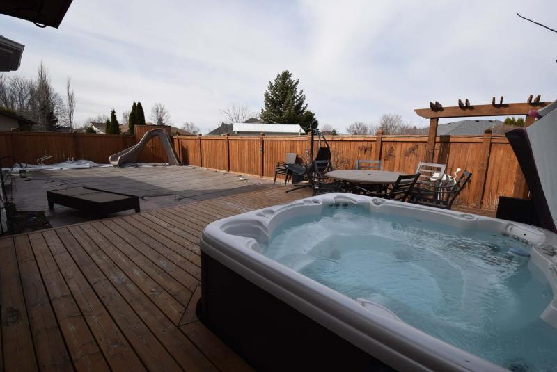 The fenced backyard is a resort-like area with a pool, hot tub, deck and patio.