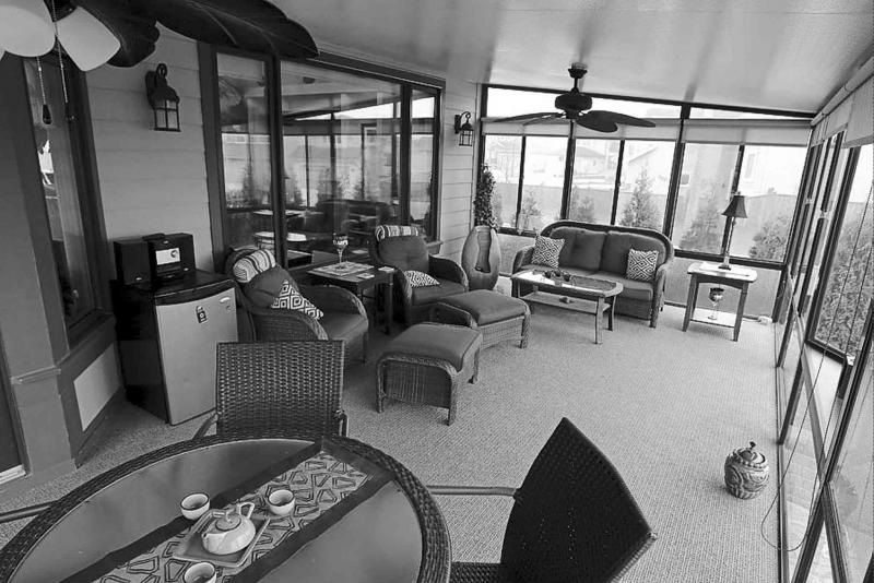 "There's a patio door on the kitchen's rear wall that leads to a three-season (12-foot by 24-foot) sunroom the owners had positioned so it would overlook the water perfectly," explained Dram. "It's a great place to entertain or relax. There's also an open deck next to it that you can barbeque on."