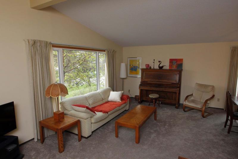 There’s a vaulted ceiling in the living room, dining room and kitchen.