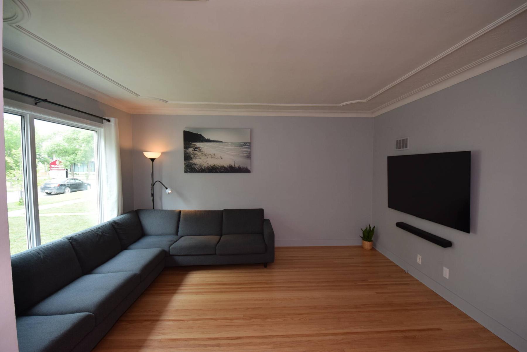 “Lots of natural light comes into it through a large, newer window on its rear wall. The hardwoods were refinished and look great, and there’s plenty of room for furniture and a TV, or possibly even a dining table if you put the TV downstairs.”
