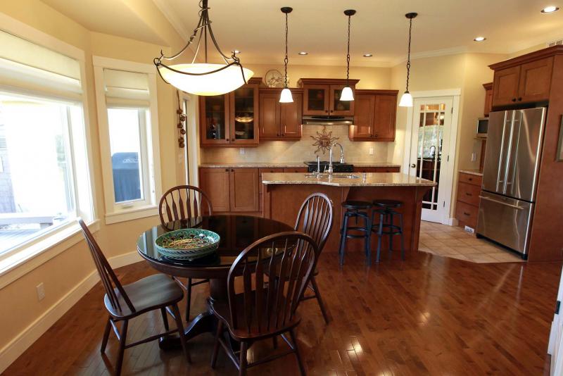 The kitchen's grantie countertops and bronze-tinted ceramic backsplash mesh well with all of the wood.