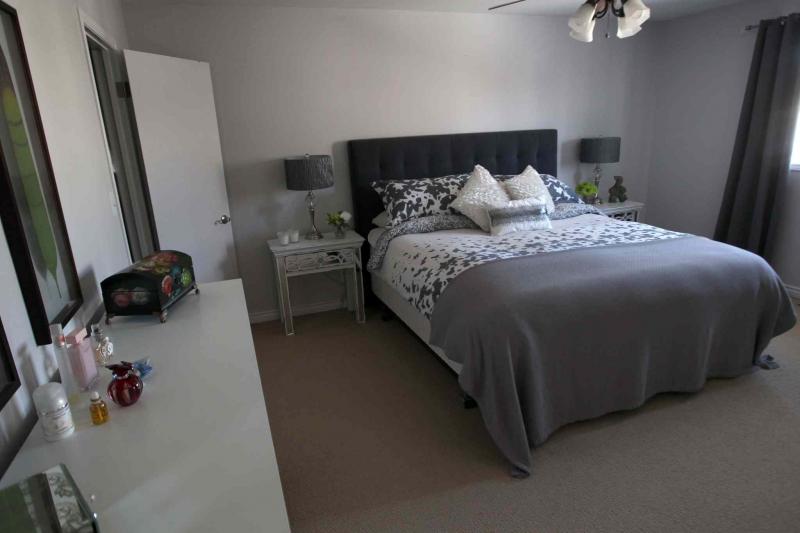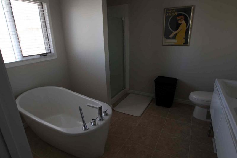 "You get a gorgeous, modern ensuite with a big window, tan tile floor, double white vanity with stainless steel legs, plus a stand-alone soaker tub and a corner shower with tempered-glass door and white tile surround," Castelane said. "There's also a huge walk-in closet with tons of storage, including built-in shelving. All the rooms are bright due to big windows, and light floods into the upper level from an arched window that was placed high over the foyer."