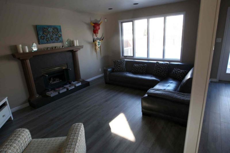"With its eating nook, (beige/grey) quartz countertops, grey glass-tile backsplash and French white (maple) cabinets, the kitchen offers as much style and function as a kitchen in a brand- new home," he said. "Its U-shaped interior makes it easy to move around and create, while a huge pantry (surrounding the fridge) and tons of cabinets offer all kinds of storage space. With its big window, gas fireplace and space, the family room is a great area to hang out with the kids or visit with company after dinner."