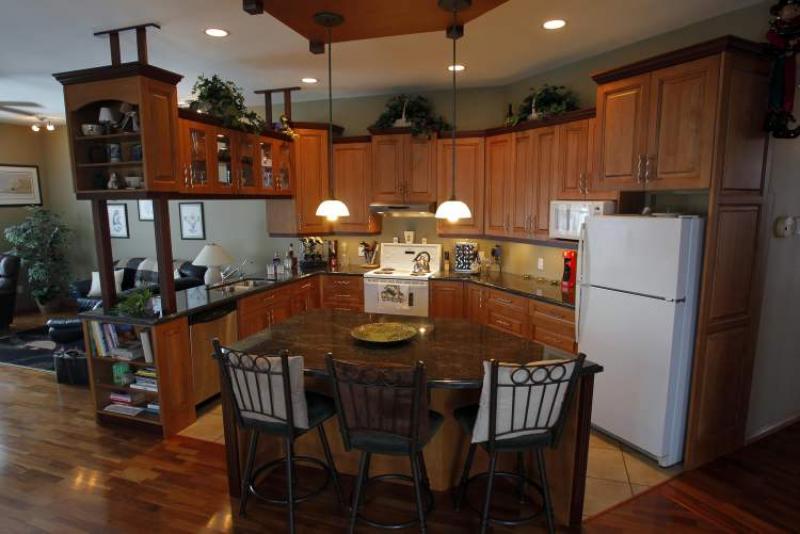 Next door is a kitchen with curved island with seating for three, and tons of counter and cabinet space. Finishing materials are rich: honey-hued maple cabinets, black granite countertops and a tan tile floor. Thanks to its U-shaped design, a peninsula of countertop (with double sink) faces the living room, allowing cooks to chat with company while preparing dinner -- or admire the golf course view through the family room's picture window.