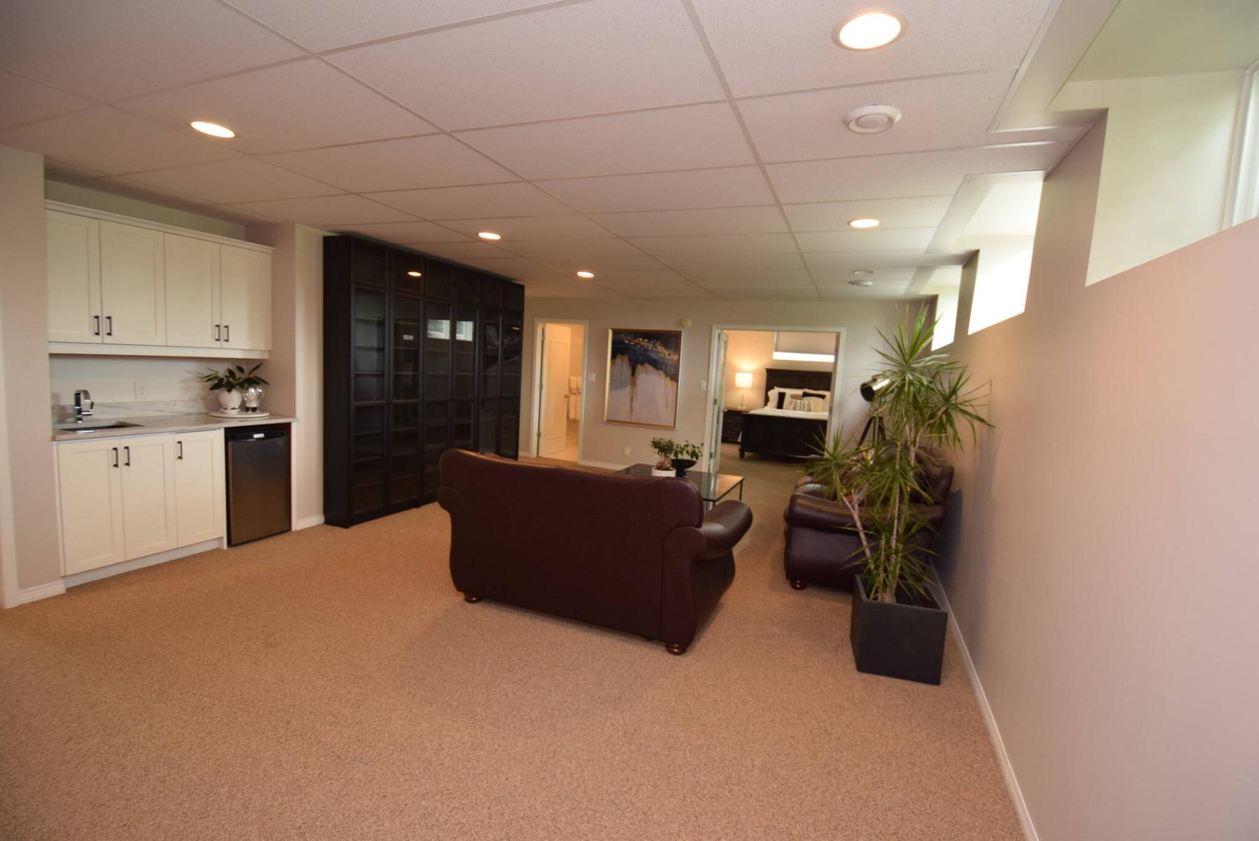 “It offers a large rec room with wet bar and stone fronted fireplace, big windows, two bedrooms, bathroom, a large laundry/storage room and a staircase that connects with the triple garage with an additional lawn tractor door. It’s a very welcoming, functional area.”