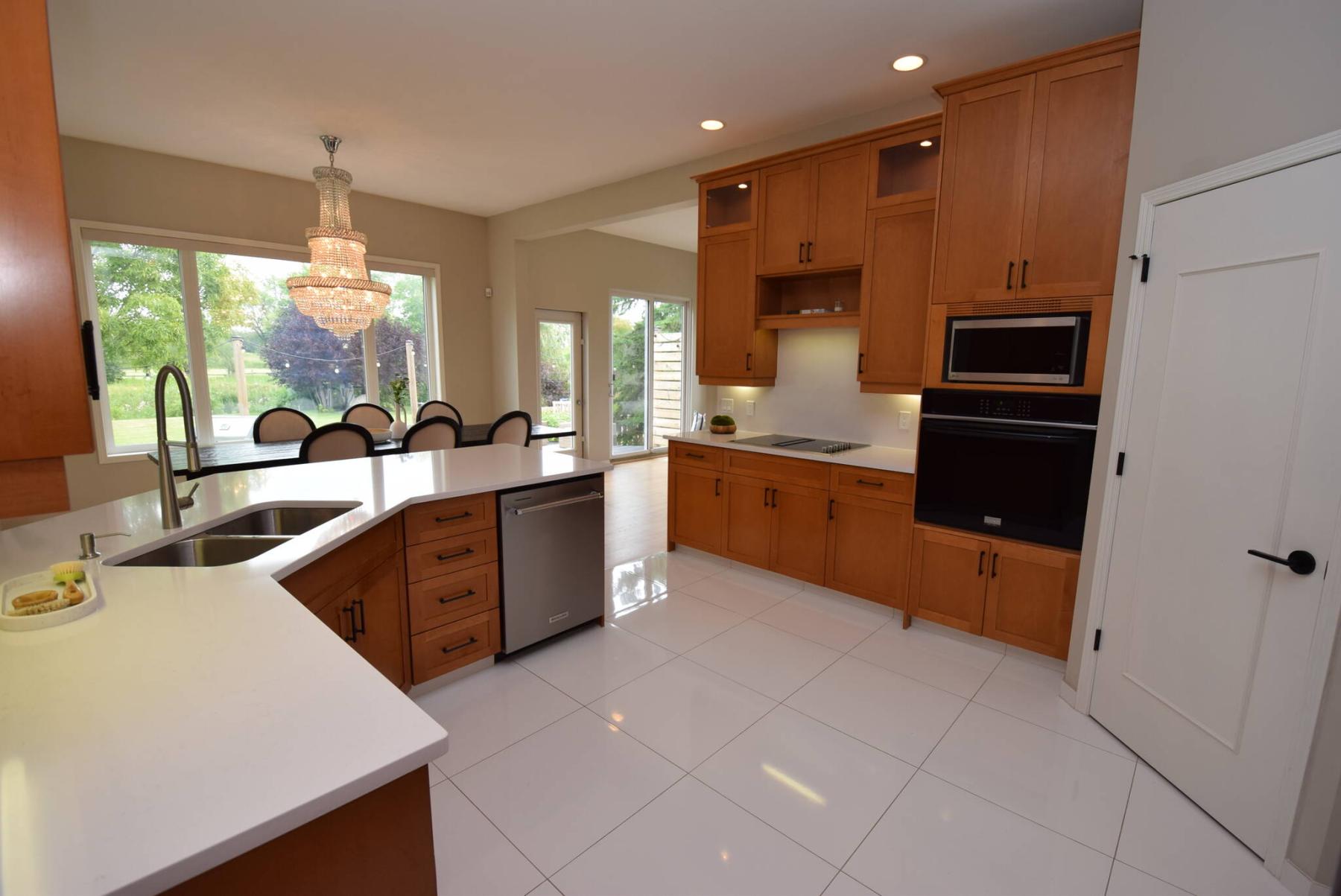 “It was tucked away perfectly to the right so you can’t see into it. Once in it, you appreciate the beautiful maple cabinets, quartz countertops, large pantry and built-in appliances. Both the cooktop and oven are built in, with the cooktop coming with a built-in downdraft fan to discreetly dispose of cooking odours.”