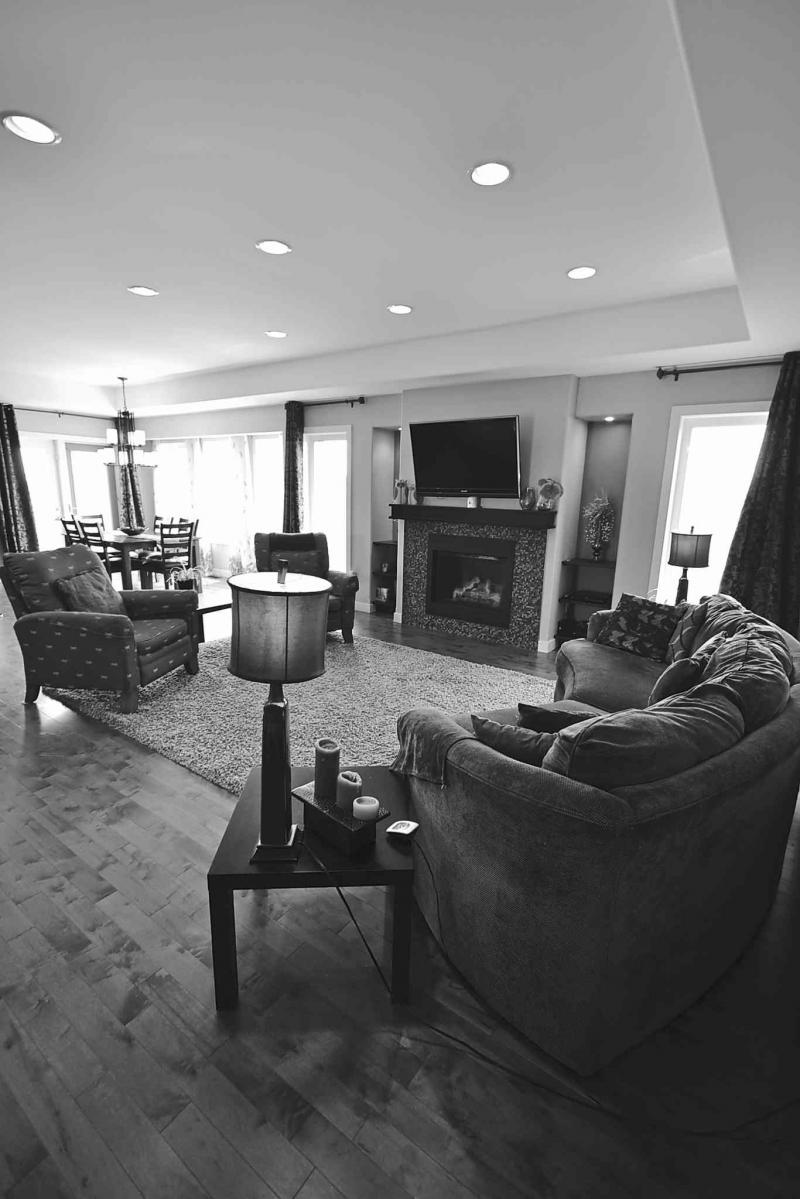Then, there's the serene family room, a space that caps off an area that's tailor-made for entertaining or relaxation. "The family room's focal point is a gas fireplace set in a tile surround with espresso mantel and TV niche above," said Wiebe. "Vertical windows were placed on either side of the fireplace to let in even more natural light -- the great room is just flooded with natural light during the day from all the windows surrounding it -- and the maple hardwoods add warmth. The tray ceiling above adds some nice definition, and extra ceiling height."