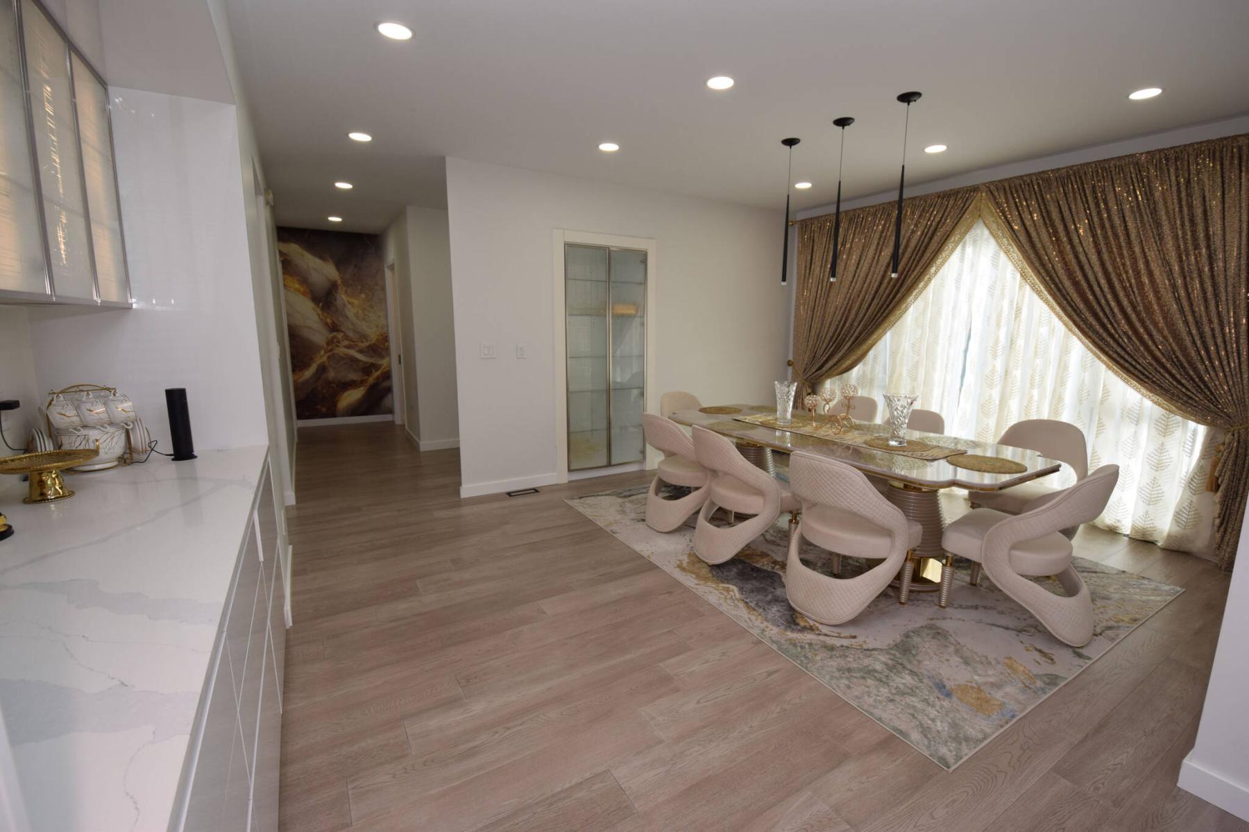 “There’s a formal dining room, an elegant space defined by a large window and modern black pendant lighting. It also has a built-in sideboard with built-in cabinets. It’s a perfect space for entertaining.”