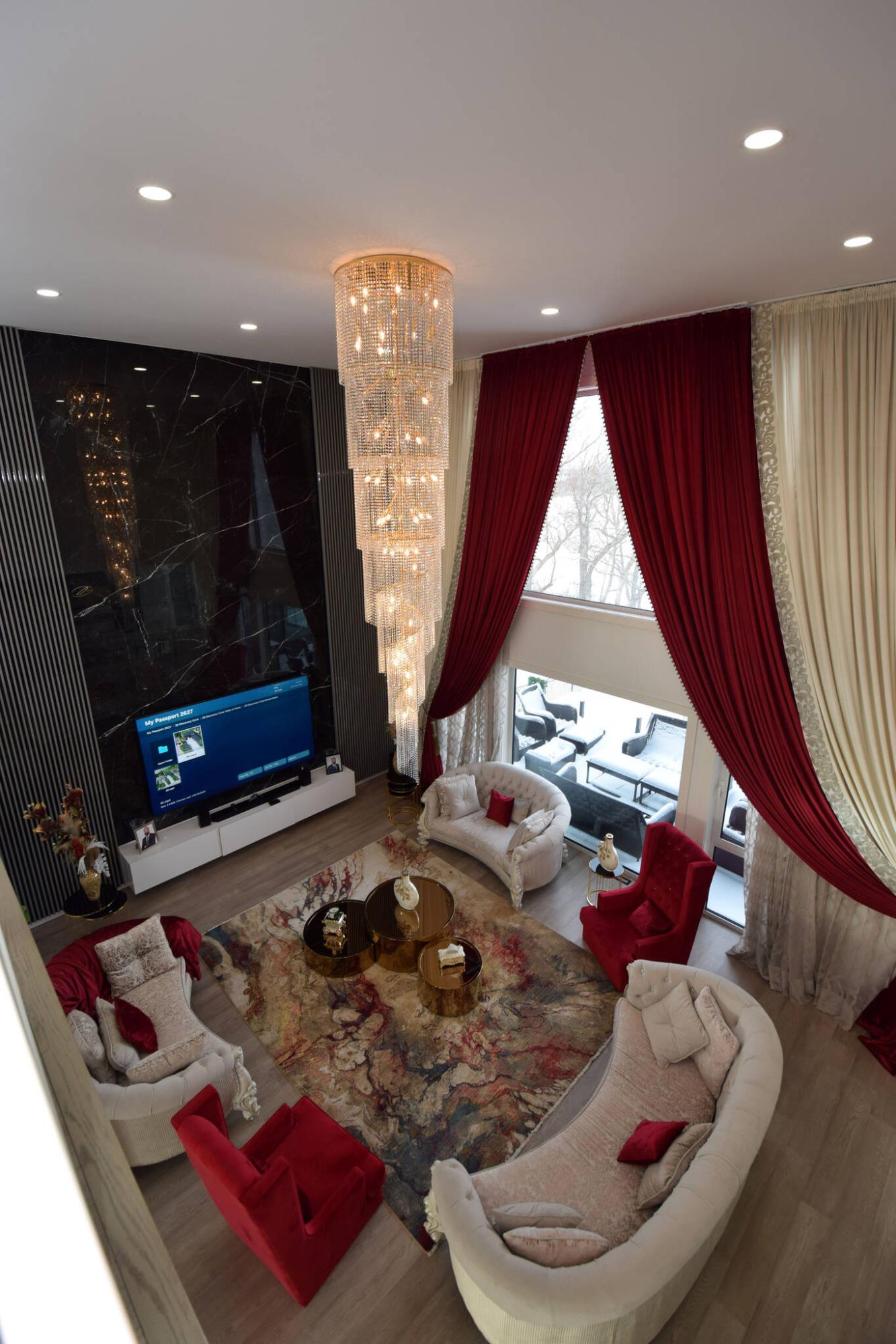 A stunning crystal chandelier serves as the focal point of the grand great room.