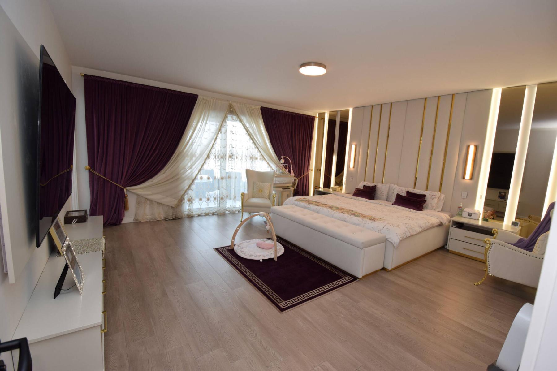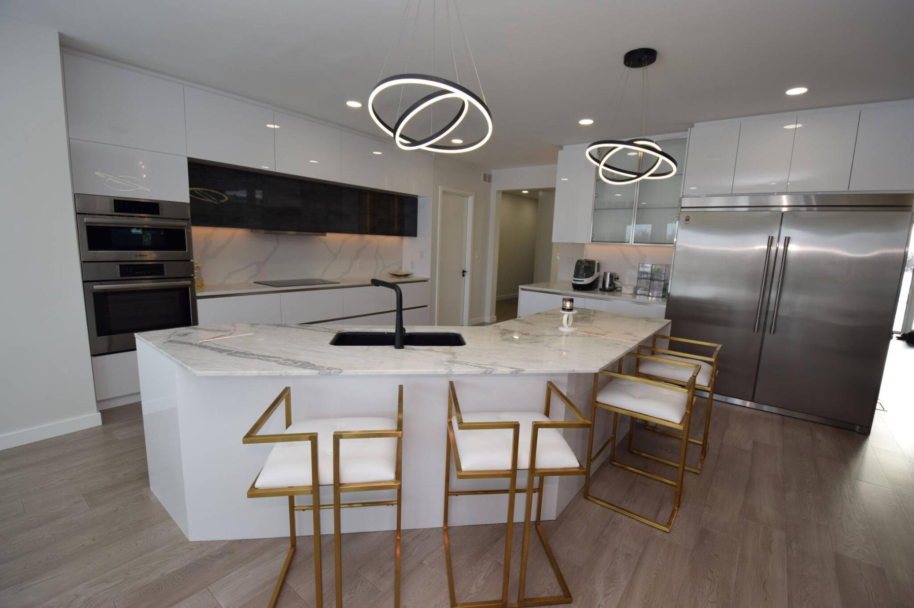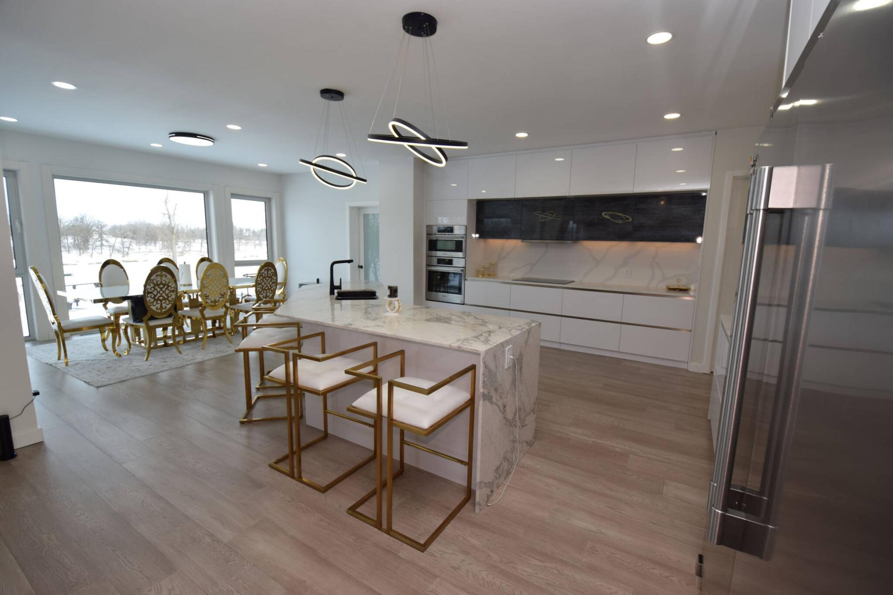 “It features an ultra-modern open-concept design with spiral LED pendant lighting, pristine white handle-less cabinetry and a large waterfall-edge island with marble-look countertops and seating for three,” MacAngus says. “The countertops are complemented by a seamless marble-look backsplash, black matte fixtures and high-end stainless appliances. There’s also a spice kitchen, too.”