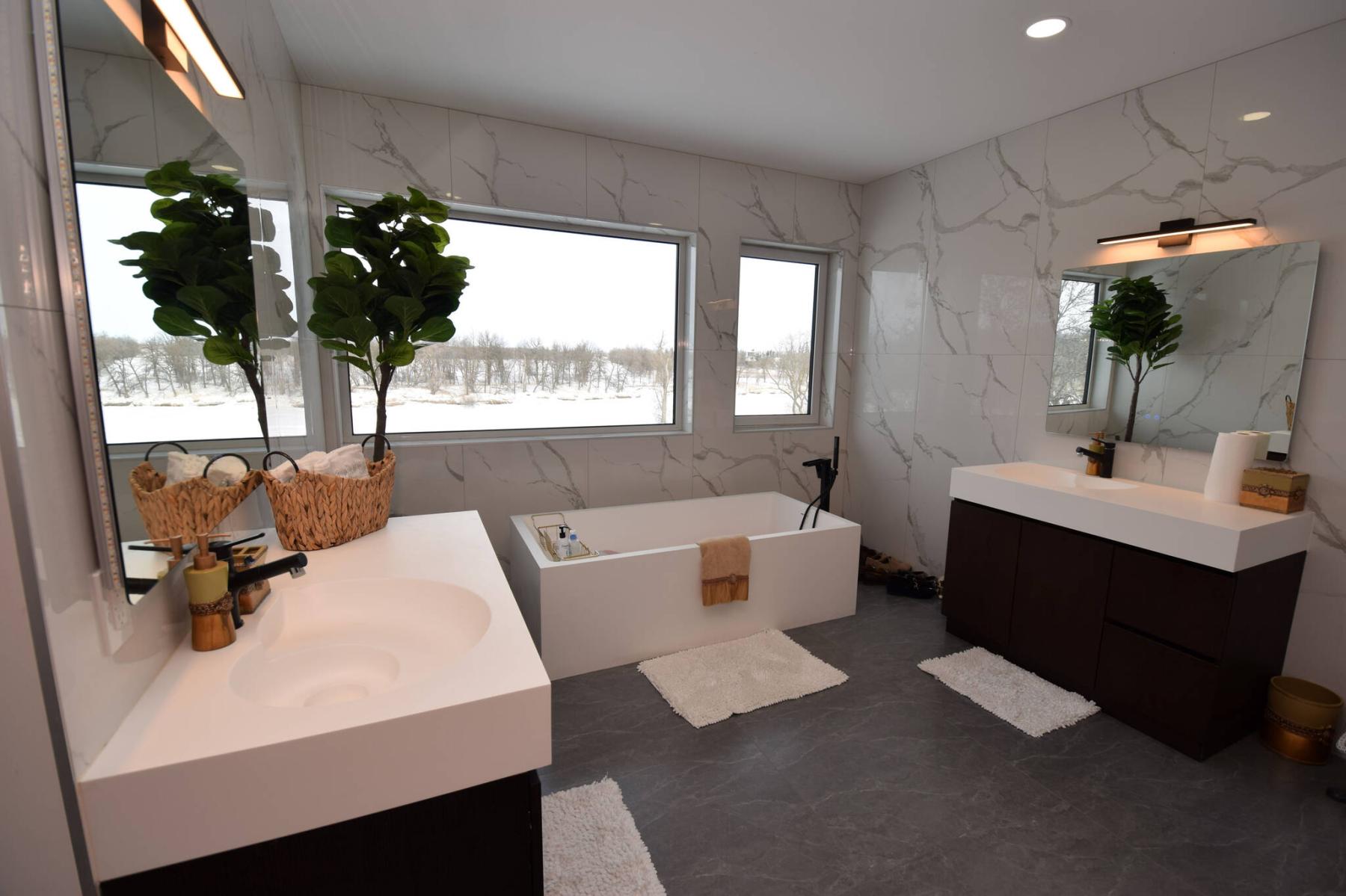 The highlight of the ensuite — aside from its tiled walk-in shower and heated floor — is a freestanding soaker tub set beneath a pair of windows that perfectly frame the river view below.