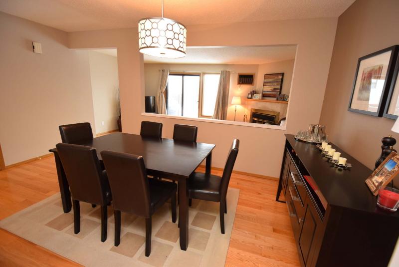 Just steps away from the kitchen is the dining room, which has ample room for a large table and chairs plus a side table in behind. The taupe feature wall behind the side table and circular light fixture over the table are nice touches.