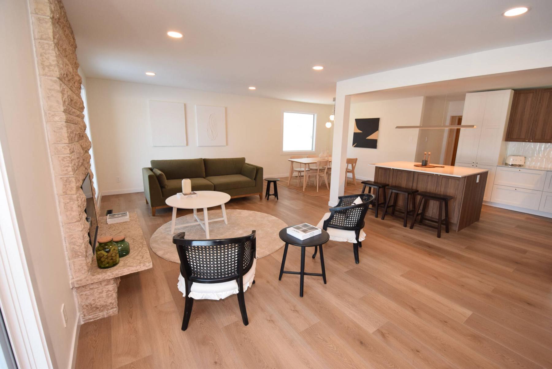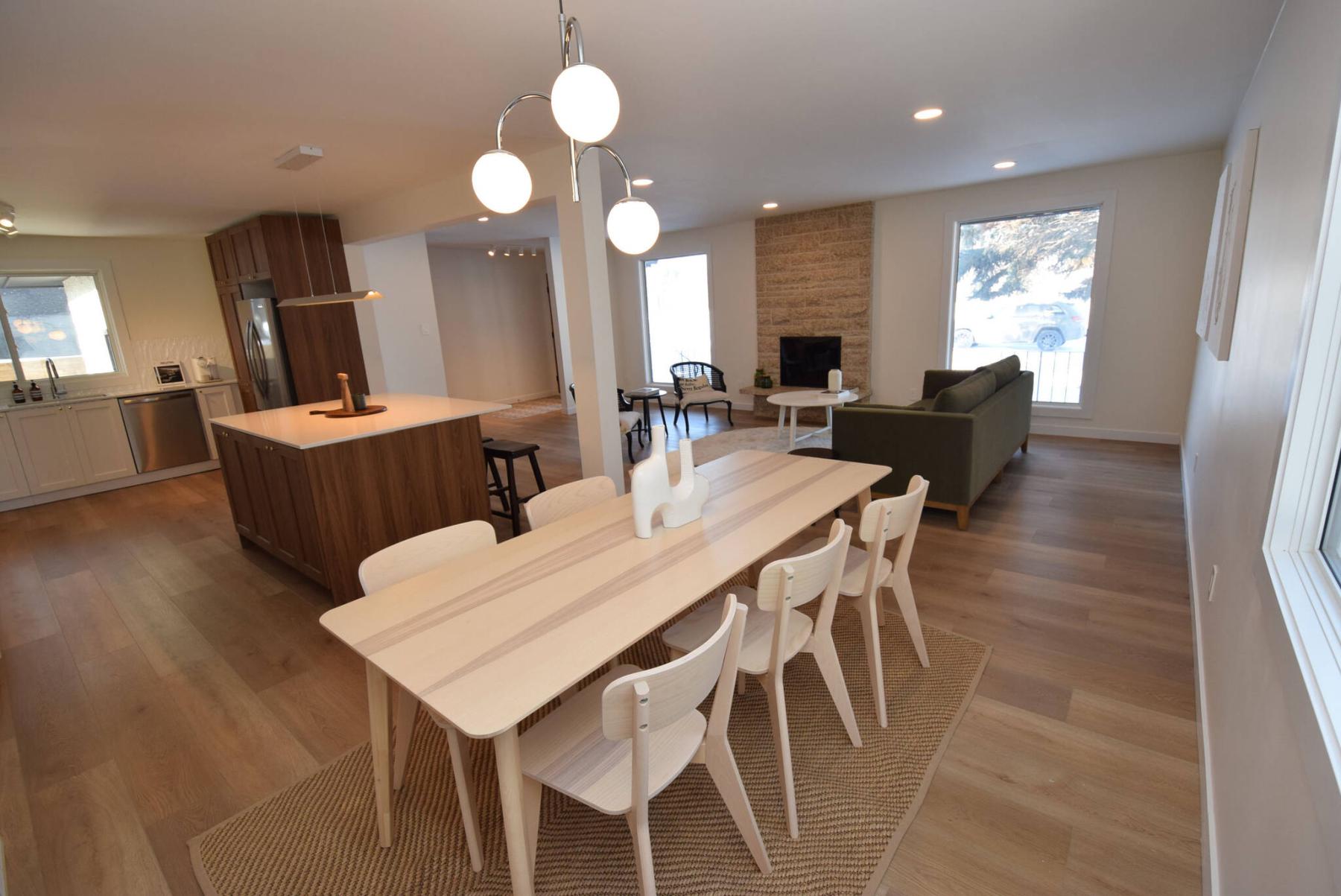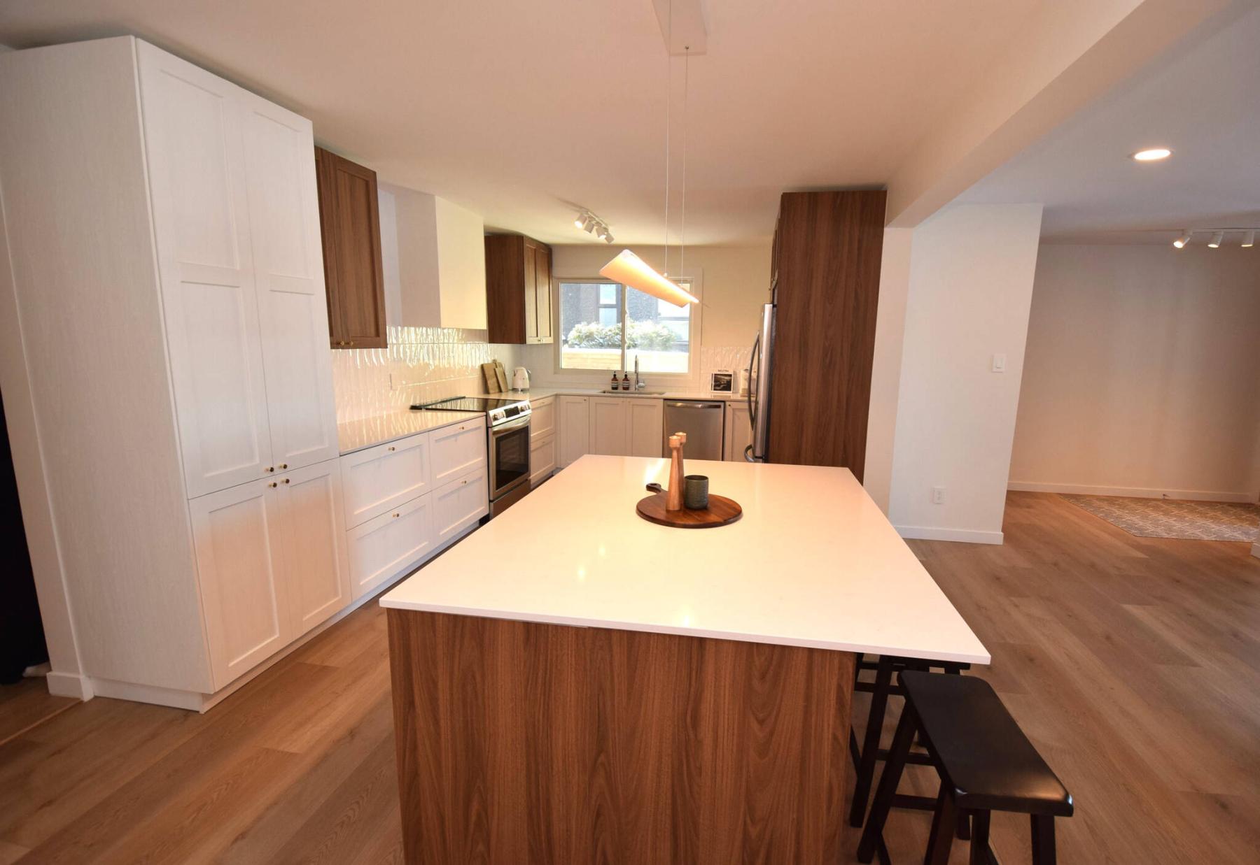 “A large island with breakfast nook for three was installed along with two-tone cabinets, quartz countertops, a tile backsplash and brand-new stainless-steel appliances,” Kirady says. “Now there’s lots of counter space and much better functionality in the kitchen, right through into the dining area and living room.”