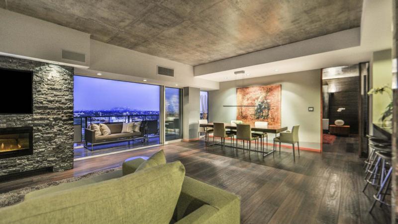 Found within a remodelled 14-storey building, the two-bedroom, three-bathroom unit features such details as raised ceilings finished in raw concrete, brushed-wood floors and exposed concrete beams. Fleetwood doors, which lead to a private balcony, take in unobstructed city views.