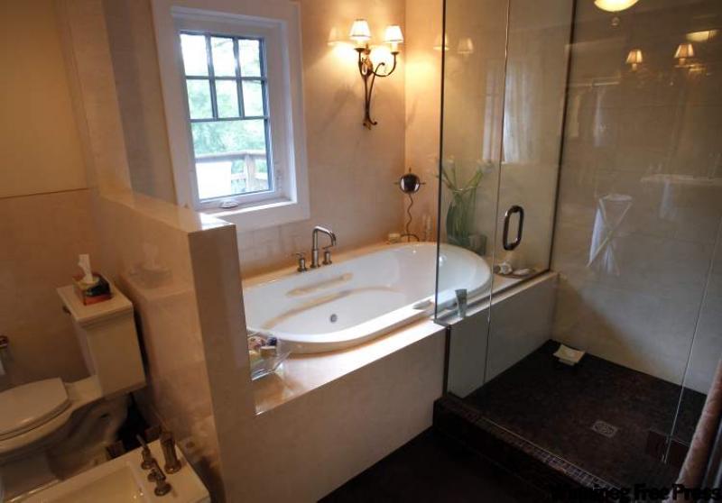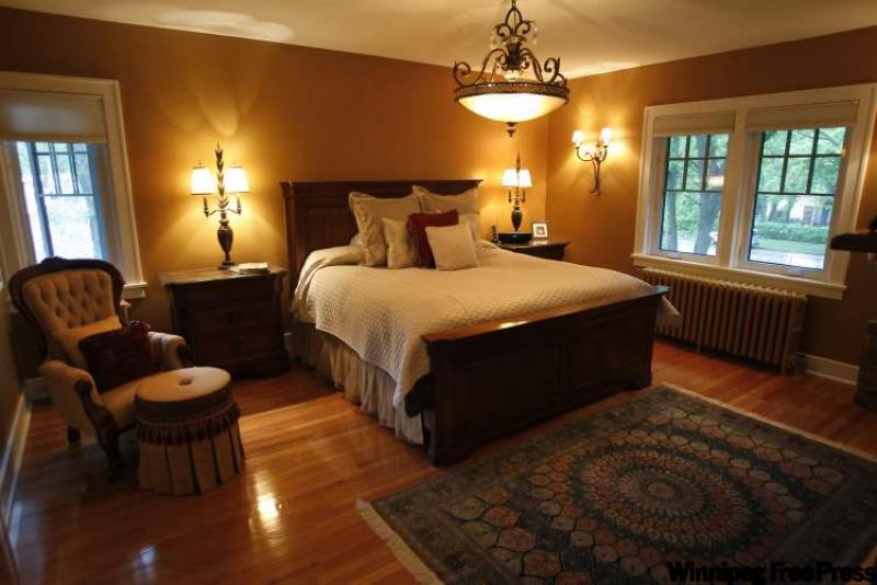 "This is where we did most of the work," Greg said. "We put in double french doors, then opened up the left-hand wall to put in an ensuite. It has a jetted tub (set in laser-cut beige tile), four-foot shower, heated (dark brown) porcelain floor and a beautiful vanity that was set on a background of bronze Italian glass mosaic tile."