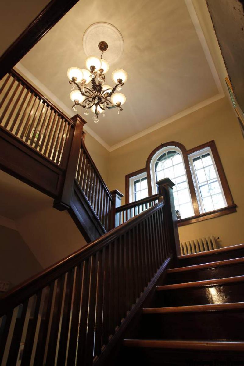 The focal point of the grand foyer is a grand staircase with mahogany railing, spindles and risers, as well as birch trim (courtesy of Greg and wife Lucy) for contrast. Three original fixtures -- a carriage light and wall sconce in the foyer and sconce in the dining room -- add yesteryear character, while the refinished, original oak floors gleam just as they did back in the Roaring '20s.