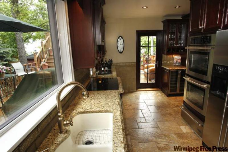 "We call it our performance galley kitchen," Greg said. "We put in new (cherry) cabinetry, granite countertops, flooring (chiselled edge travertine tile), and a clear glass backsplash with bronze background.