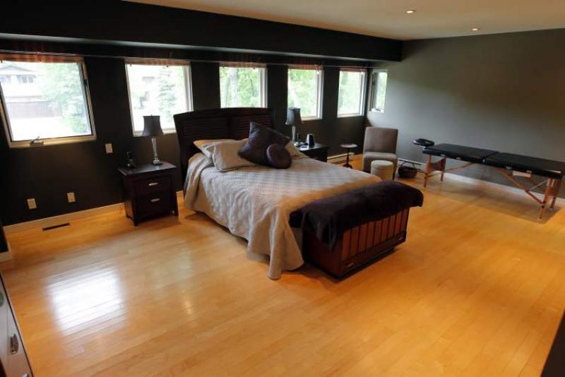 "The master suite is extra large, and will easily accommodate the largest furniture and then-some," said van den Broek. "Like the other two bedrooms, it features natural maple hardwoods, which contrast beautifully with the dark maple hardwoods in the landing area. The ensuite offers double pedestal sinks, a heated porcelain tile floor, custom-tiled walk-in shower and a curved wall with lit porthole windows."