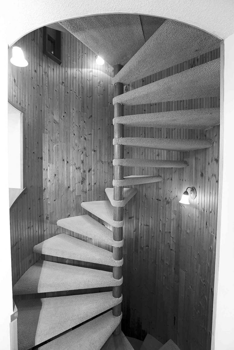A circular staircase takes you to an elevated bedroom wing and a unique lower level.