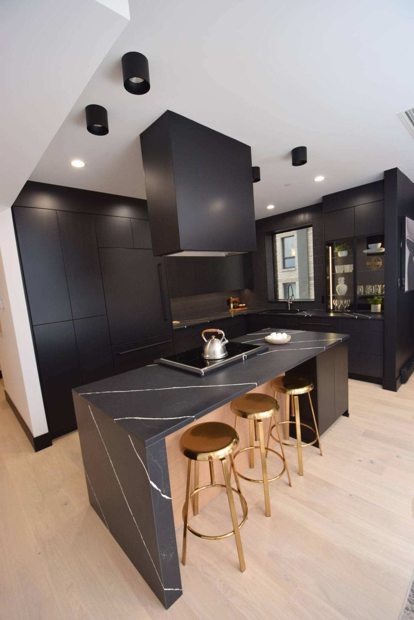 Gorgeous black cabinetry surrounds the kitchen, while a custom black hood fan, built-in induction cooktop (and oven) and recessed, high-end appliances with cladding that matches the surrounding cabinetry gives the area a sleek, streamlined feel.