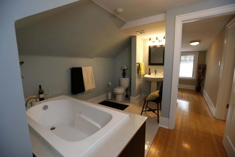 Head upstairs via a long, enclosed staircase, and you find a huge bedroom set next to an ensuite that offers a welcome touch of luxury. "There’s a huge bedroom (15.4 feet by 11.25 feet) with beautiful maple hardwoods, huge window and good-sized clothes closet — plus a four-piece bathroom with soaker tub, ceramic tile flooring and pedestal sink," he said. "It could be used as master suite due to being next to the bathroom, which is basically an ensuite, or would be ideal for a teenager."
