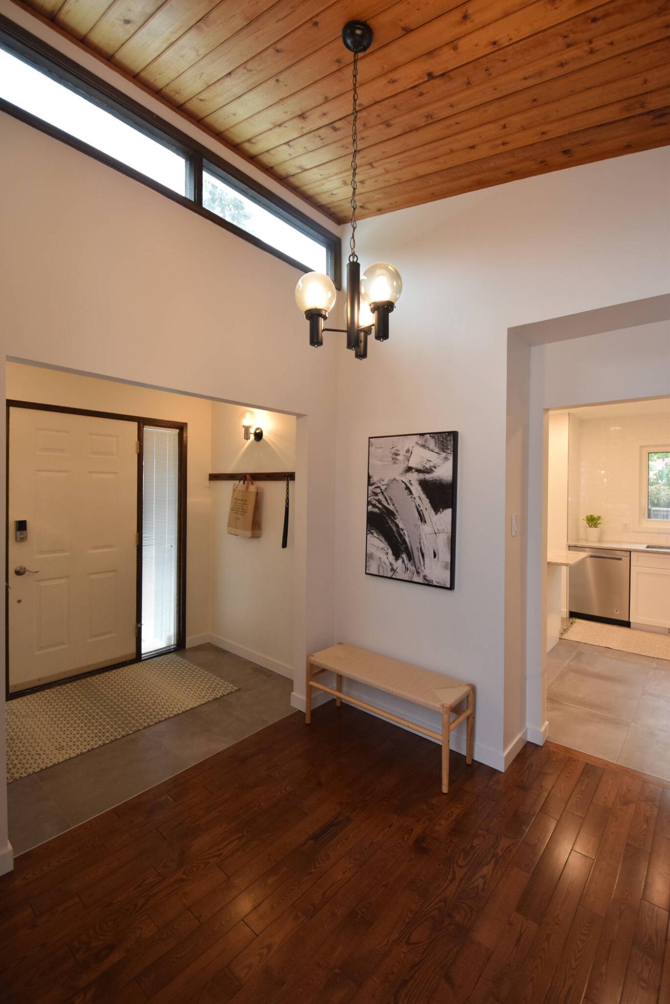 A spacious foyer with vaulted, cedar-lined ceiling and streamlined windows up high greets you the moment you step inside.