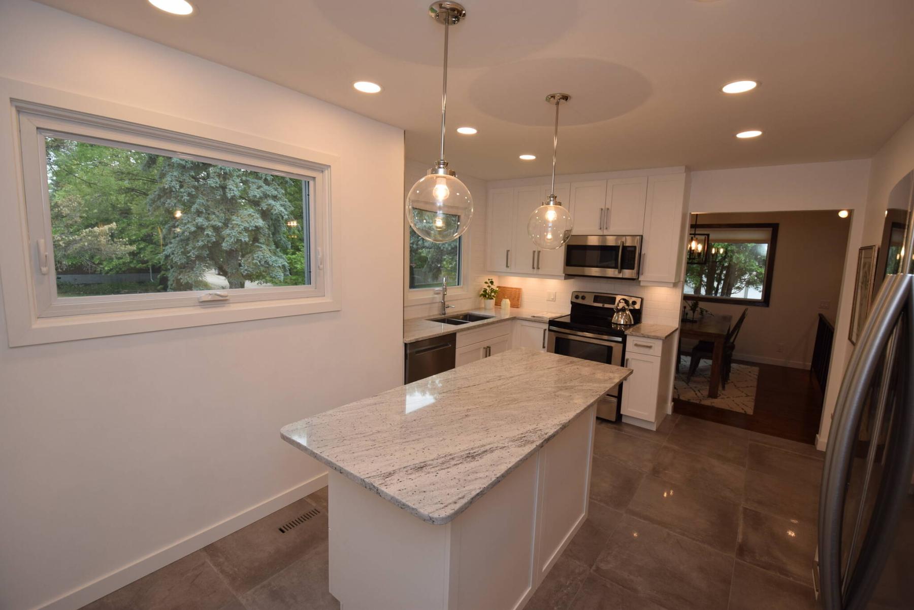 “The only word that can really describe it is stunning,” he says. “It’s been completely updated with a grey porcelain tile floor, granite countertops, loads of white cabinets, white tile backsplash and stainless appliances. There’s a door that provides access to the garage to the left, and a doorway that leads into the dining room to the right.”
