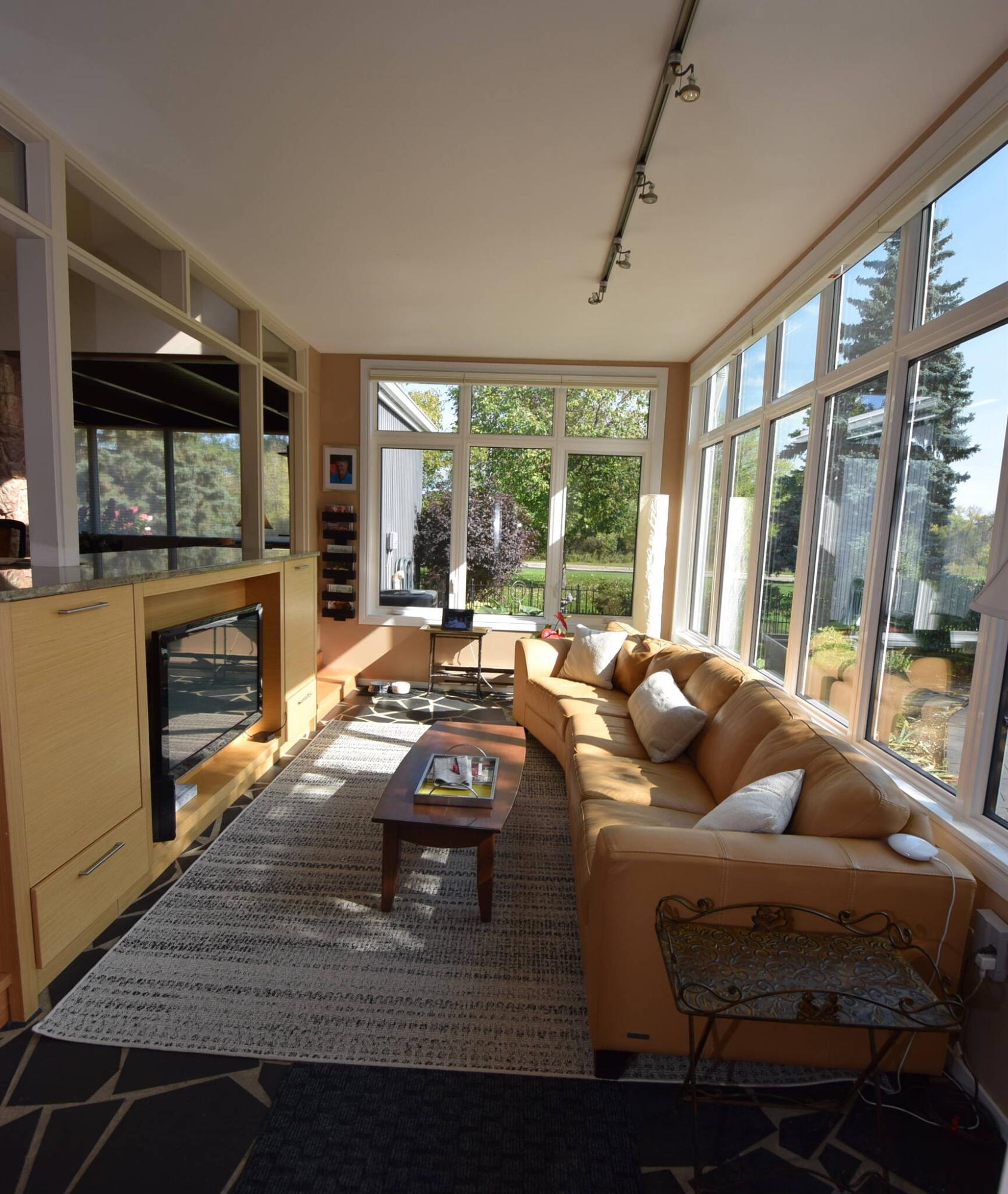 Surrounded by glass, the four-season sunroom is a delightful, sun-filled space.