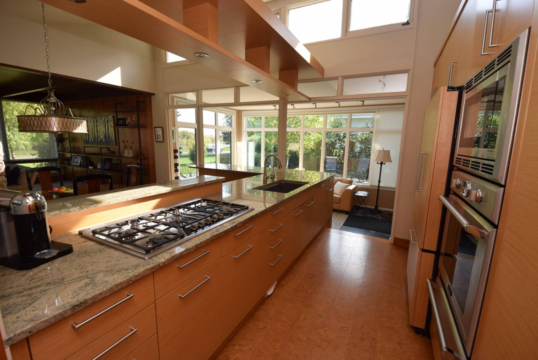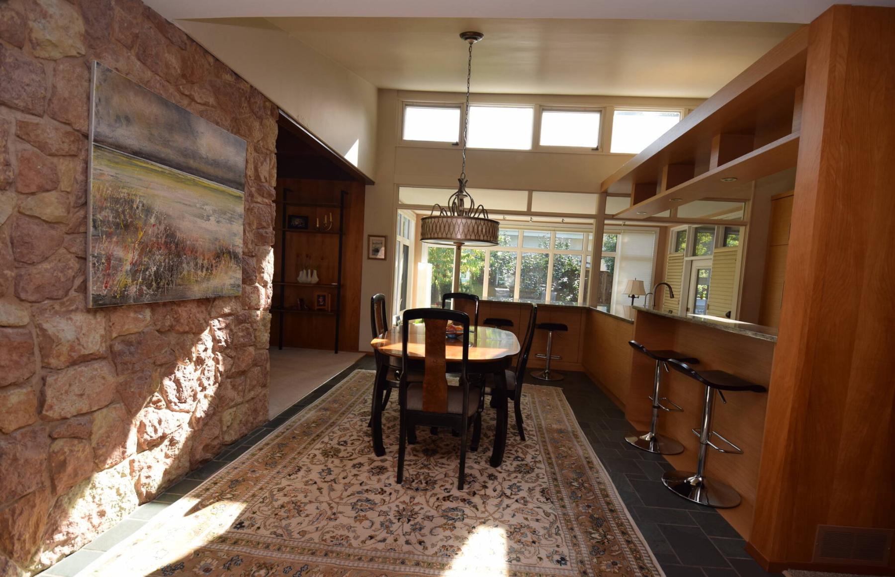 Mid-century modern and contemporary design details combine to create an impressive dining/kitchen area.